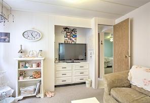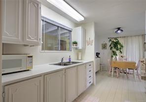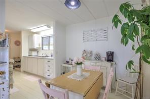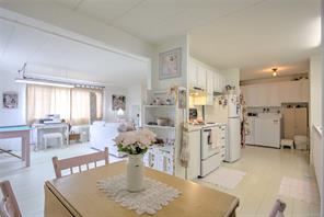 This double wide mobile home is so bright and welcoming and has a open layout. Great living space with 1056 sqft, well laid out kitchen with separate eating area, large living room, 2 bedrooms plus a den, lots of storage (6 x10) and workshop (6×7). There is also lots of covered outside space including a deck which looks out to the peaceful seasonal creek. There is a carport as well to keep the vehicle dry in the winter and cooler in the summer. The park has a great community feel and is very well run. It is close to shopping, recreation, restaurants and golf course. 55 plus, sorry no cats or dogs permitted.