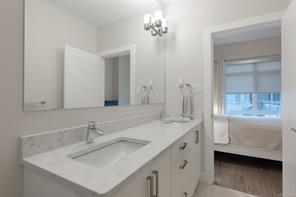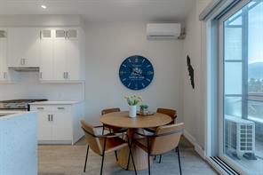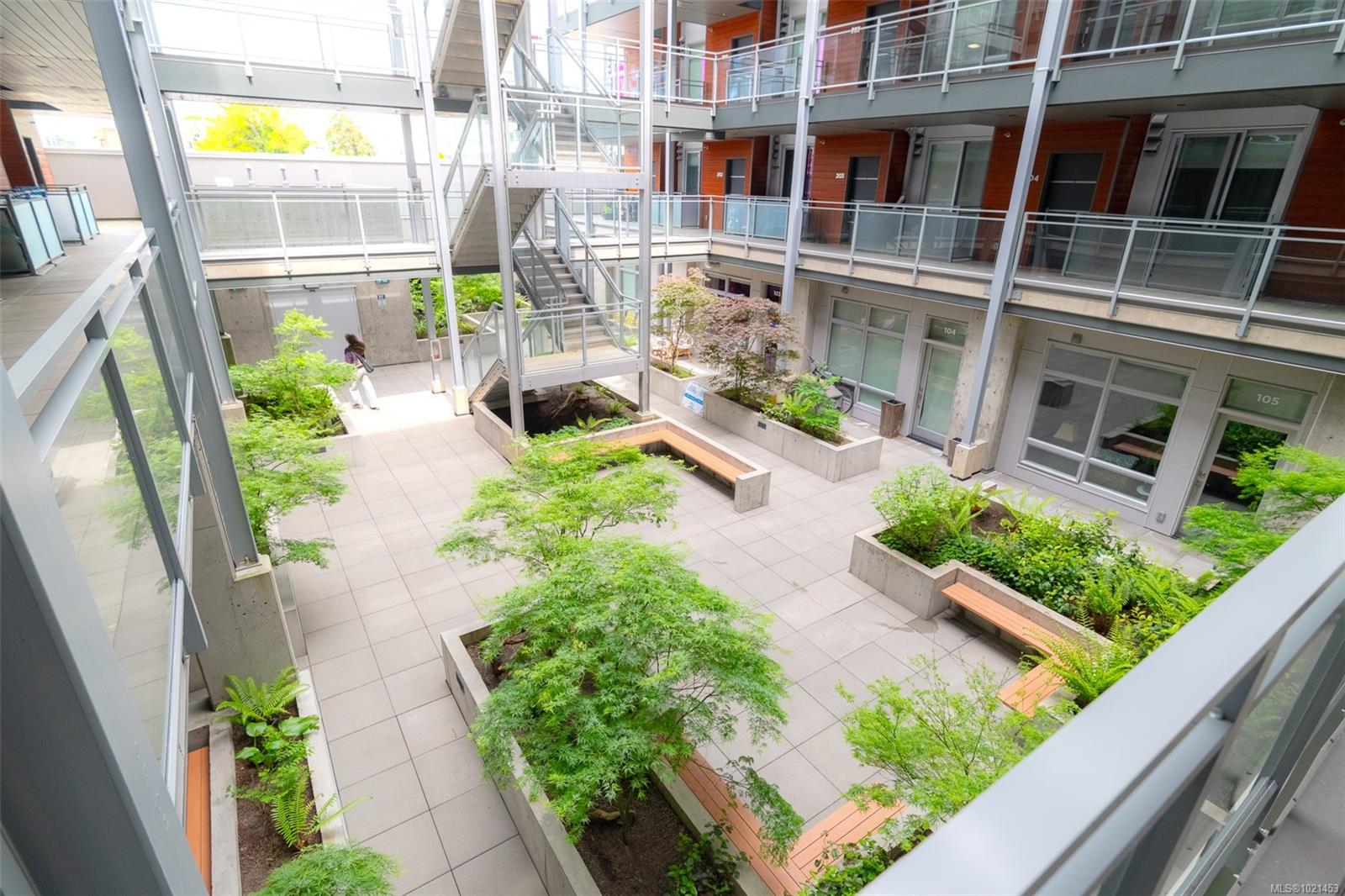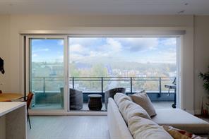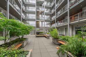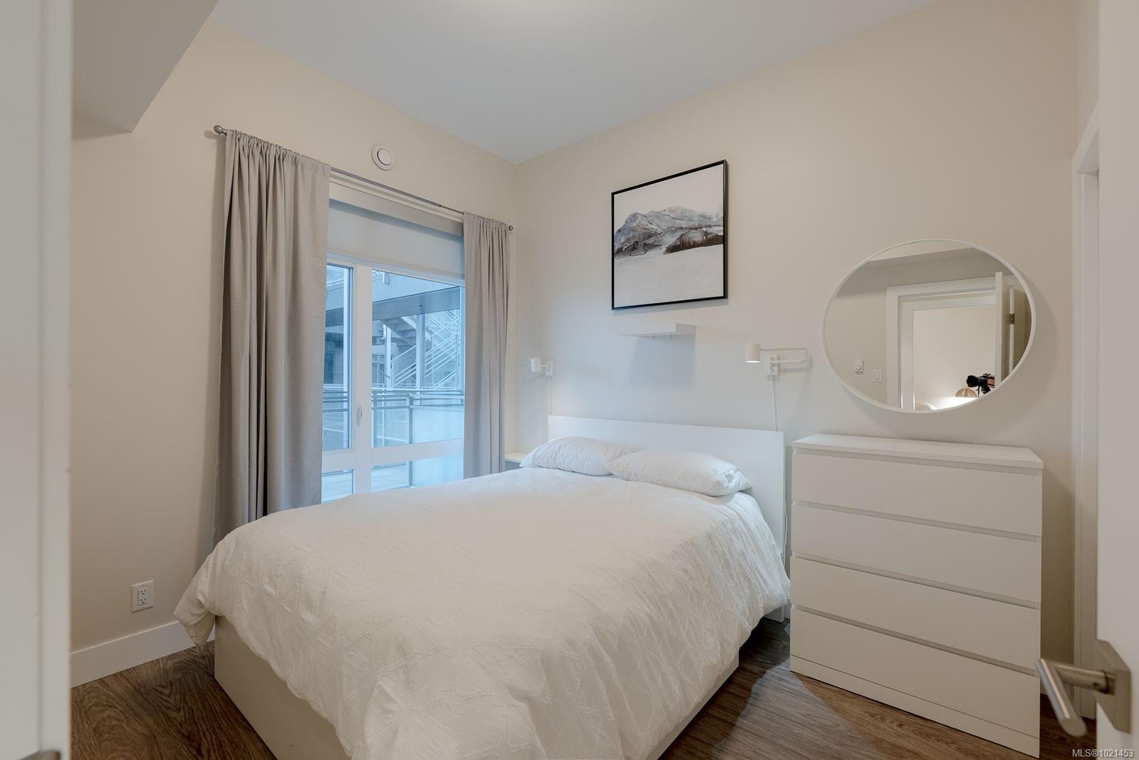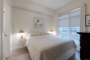 Executive corner-unit suite with panoramic mountain and ocean views in the heart of downtown Nanaimo. This 2-bed, 2-bath West Coast–inspired home features a refined primary suite with a walk-in closet and a spa-like ensuite with dual sinks and a glass walk-in shower. The open living area boasts 10-foot ceilings and 16-foot retractable glass doors that fill the space with natural light and open to a large south-facing balcony with a gas hookup. High-end finishes include a gas fireplace, stainless steel appliance package with gas stove, Caesarstone waterfall countertops, European soft-close cabinetry, and Grohe faucets. Added conveniences include roller shades, a new heat pump, secure underground parking and storage, plus bike, kayak, and paddleboard storage. Residents also enjoy a landscaped communal courtyard in one of Nanaimo’s most desirable downtown locations. Measurements are approximate; verify if important.