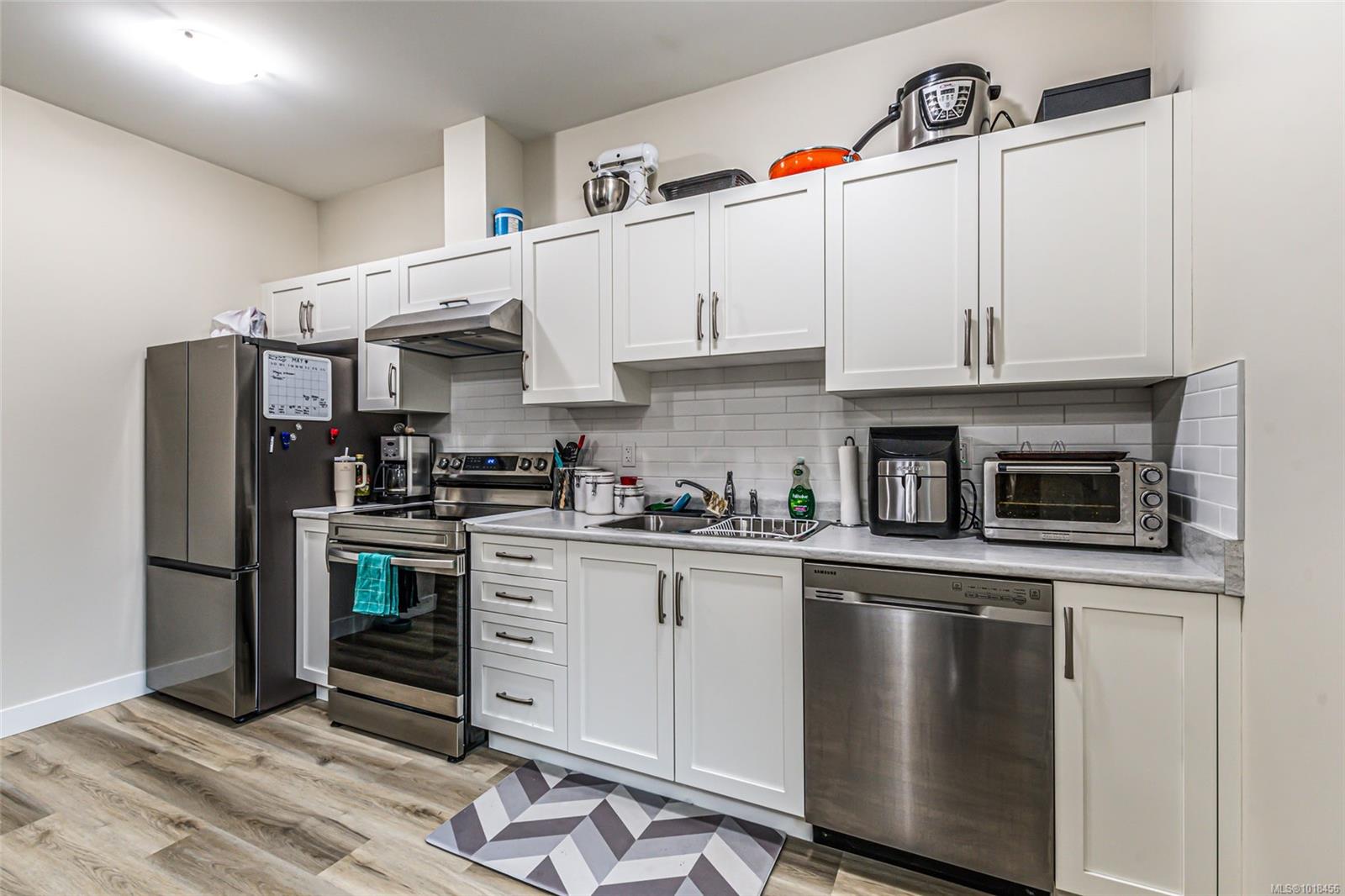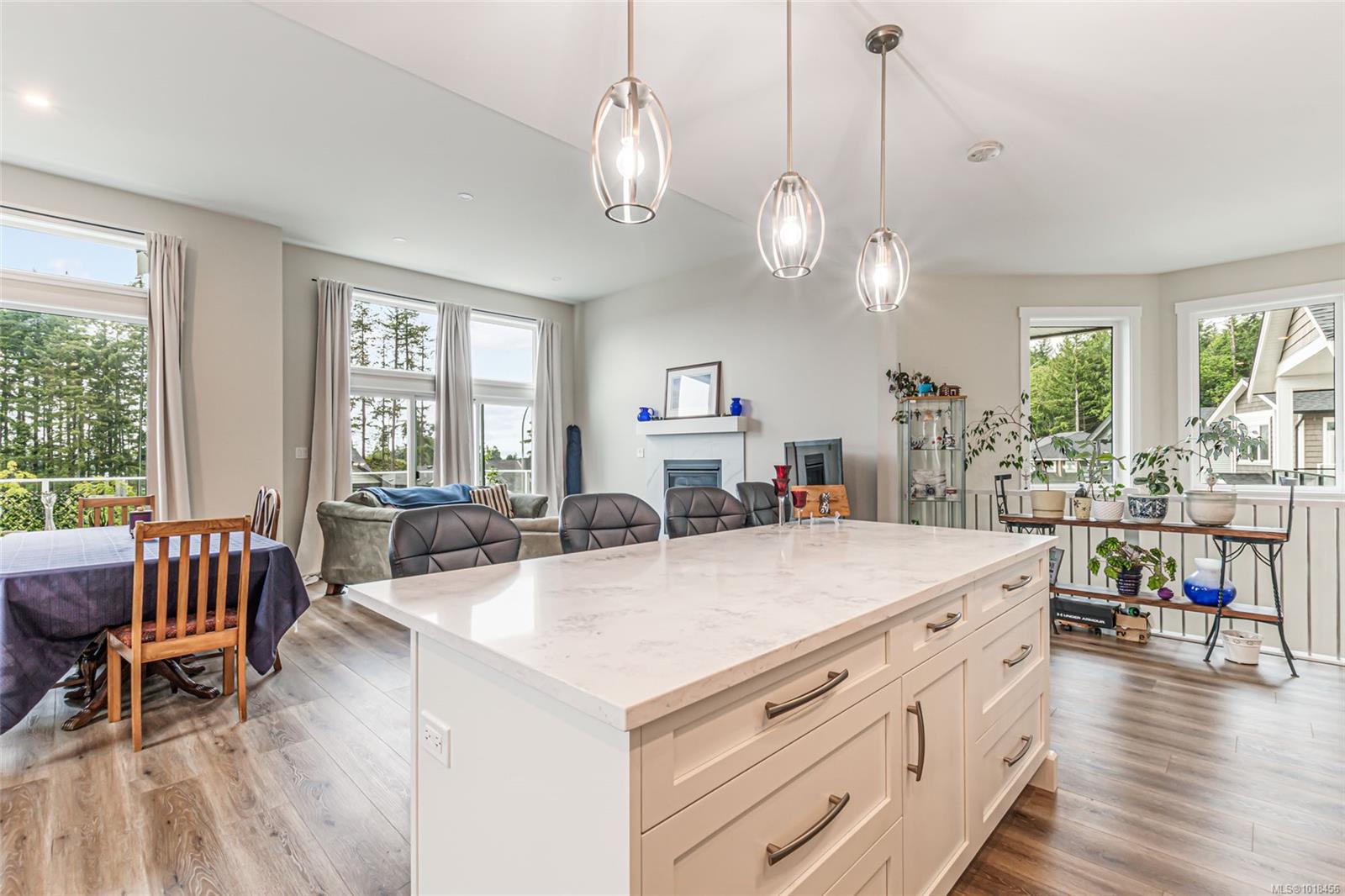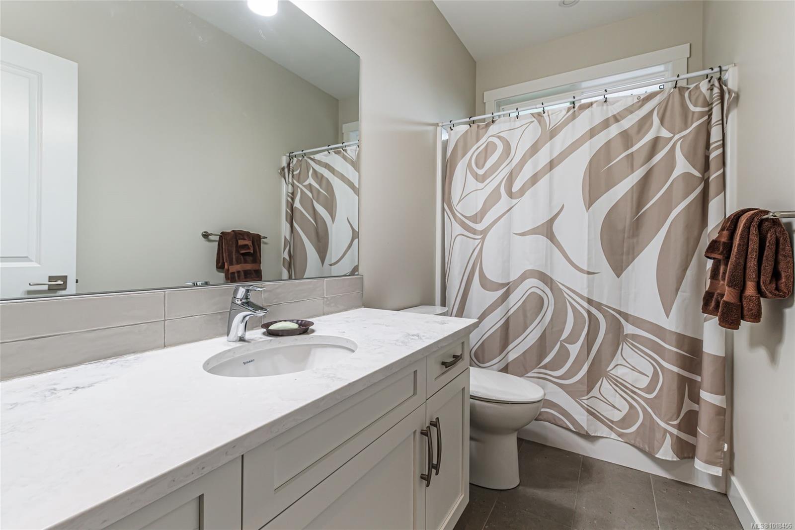 Located in a peaceful neighborhood and backing onto a forest, this well built home offers stunning ocean and mountain views and a legal two bedroom suite. Off the welcoming main foyer you’ll find an office and bathroom, with vaulted ceilings and an airy staircase to the spacious main living area. The open concept living area is highlighted by large windows, lots of natural light, a cozy gas fireplace, and opens up onto the spacious deck. Enjoy quality laminate flooring & quartz countertops throughout the home. The modern kitchen is equipped with a generous island, stainless steel appliances, and a corner pantry. The master suite boasts a walk in closet, ensuite with heated tile flooring, and double sinks. Enjoy the private back patio with easy access off the end of the hall. Downstairs boasts a legal two bedroom suite with a separate entrance, hot water tank, laundry, and storage. With beautiful views, and only minutes to downtown, amenities, and the water, this property is a must see.