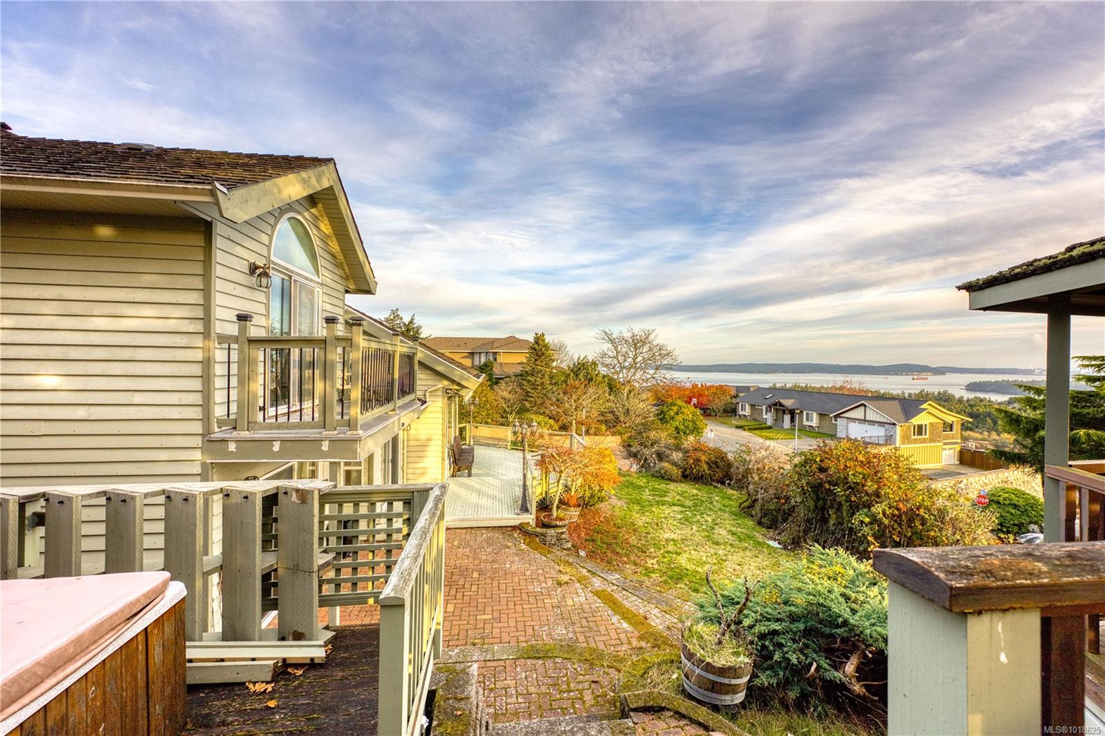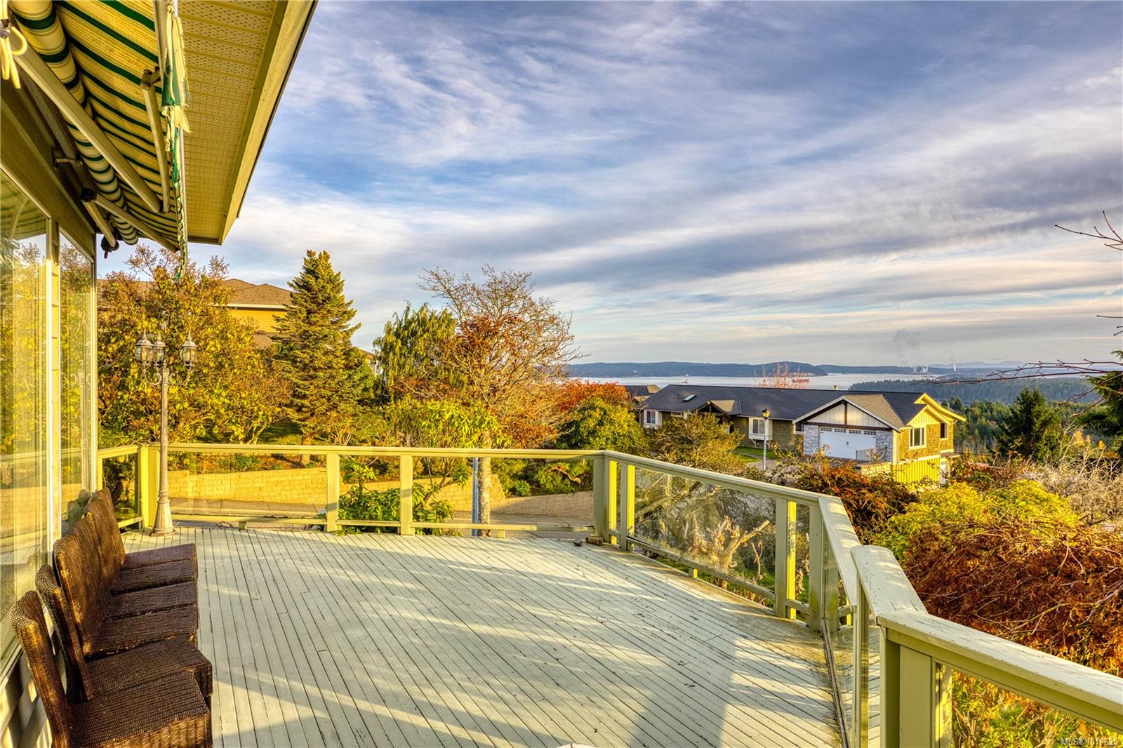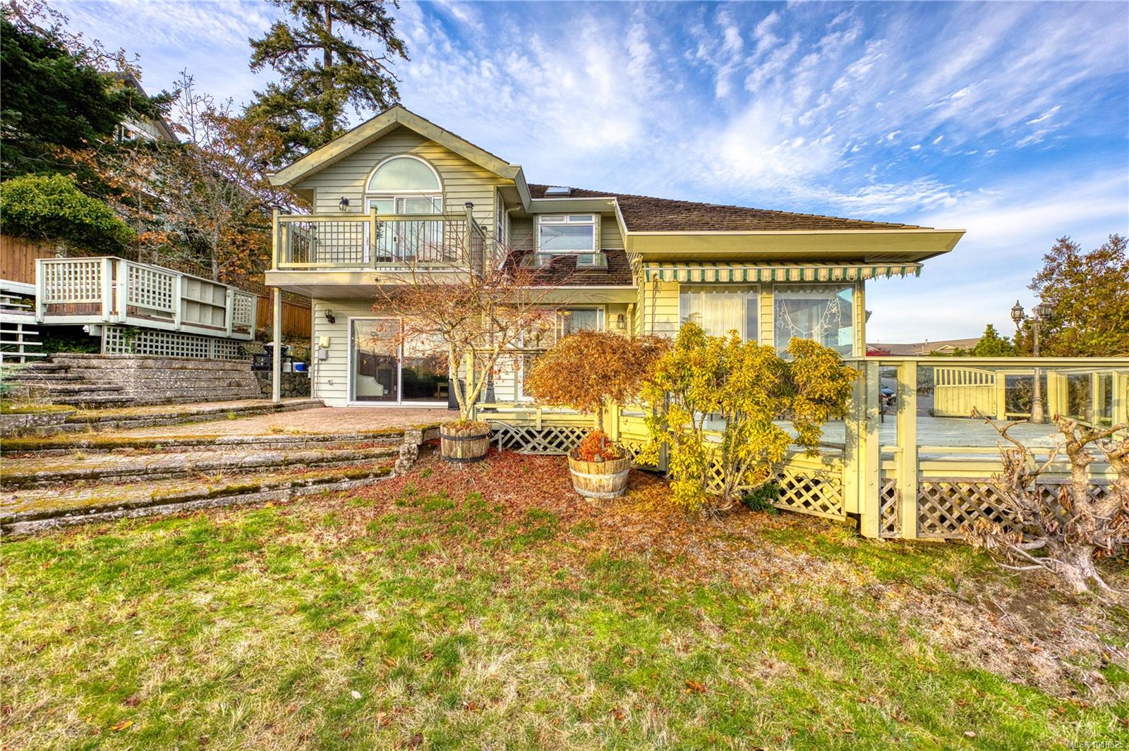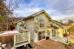 Welcome to 3688 Glen Oak Drive, where ocean, mountain, and city views unite in a stunning home, with a carriage house on site. The entry features a solid oak door with side windows, opening to a vaulted living room with a striking hanging light. The main level offers two family rooms, each with a fireplace, plus a bright dining area and kitchen with stone countertops, undermount sink, white cabinets, tile backsplash, stainless steel appliances, and an ocean-view eating nook. Step onto the large Ocean and City view patio with retractable awning overlooking Mount Benson, Nanaimo, and Gabriola/Newcastle Islands, or relax on the private rear patio. The main-floor primary bedroom includes a walk-in closet and ensuite, plus a powder room and laundry nearby. Upstairs are three bedrooms and two full baths. With breathtaking views, flexible layout, and main-level living, this home is truly exceptional. All measurements are approximate.