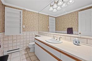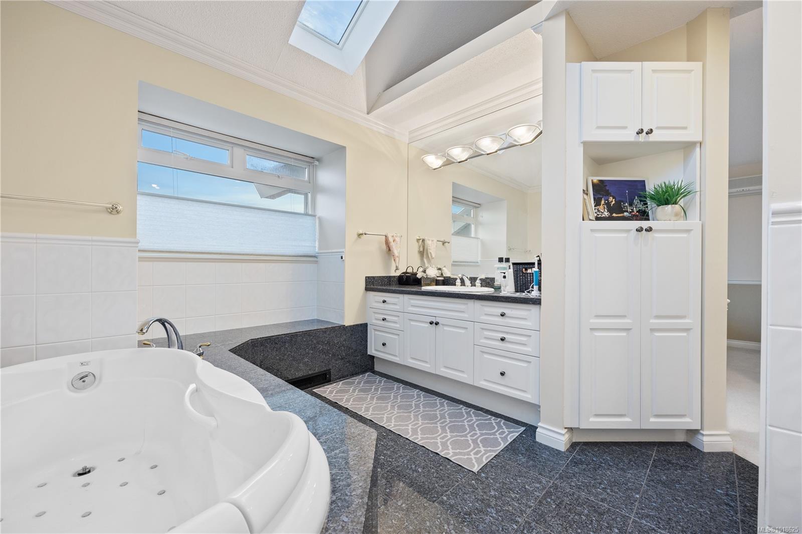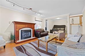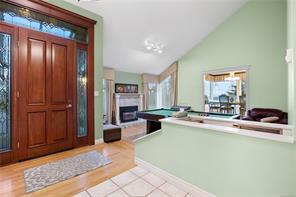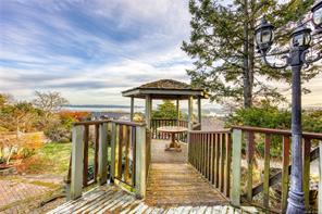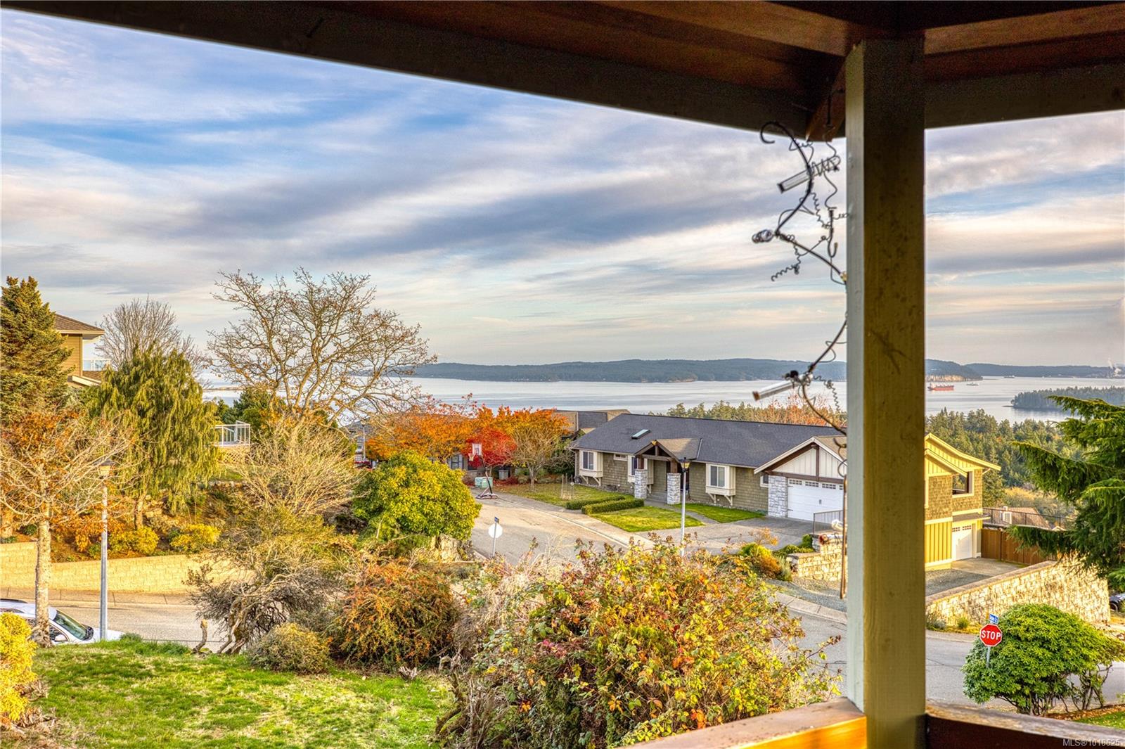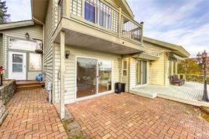 Welcome to 3688 Glen Oak Drive, where ocean, mountain, and city views unite in a stunning home, with a carriage house on site. The entry features a solid oak door with side windows, opening to a vaulted living room with a striking hanging light. The main level offers two family rooms, each with a fireplace, plus a bright dining area and kitchen with stone countertops, undermount sink, white cabinets, tile backsplash, stainless steel appliances, and an ocean-view eating nook. Step onto the large Ocean and City view patio with retractable awning overlooking Mount Benson, Nanaimo, and Gabriola/Newcastle Islands, or relax on the private rear patio. The main-floor primary bedroom includes a walk-in closet and ensuite, plus a powder room and laundry nearby. Upstairs are three bedrooms and two full baths. With breathtaking views, flexible layout, and main-level living, this home is truly exceptional. All measurements are approximate.
