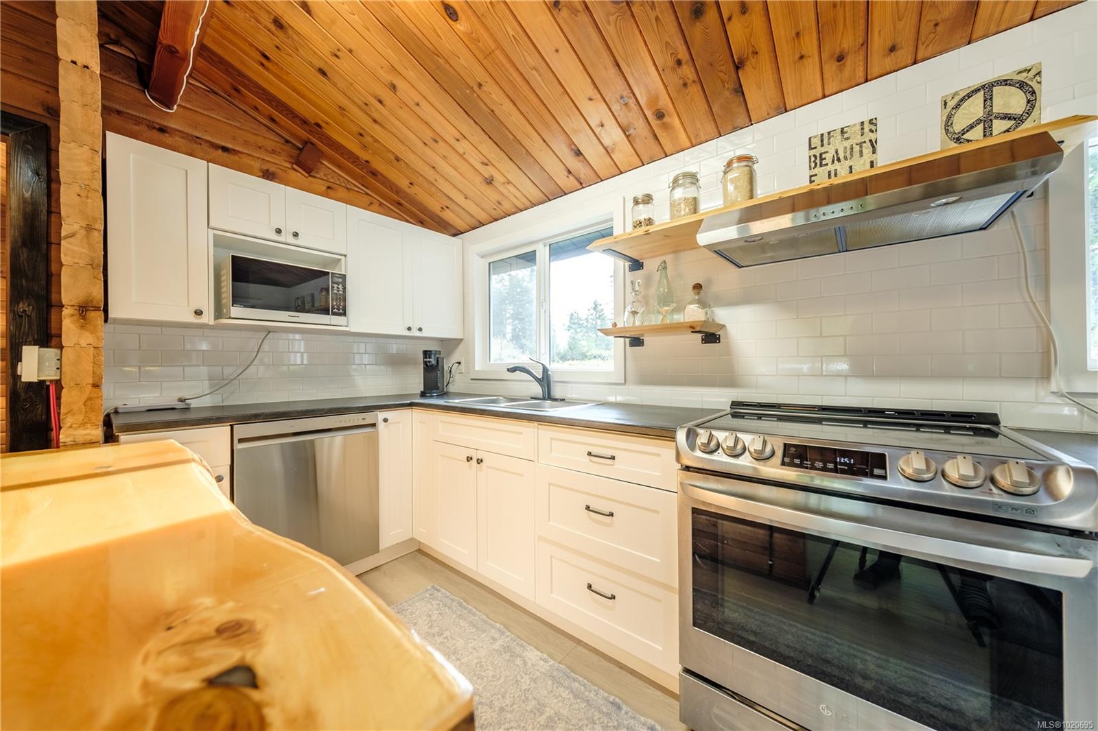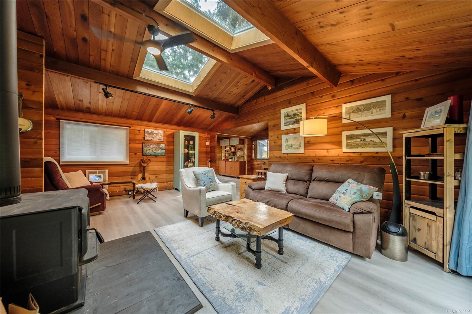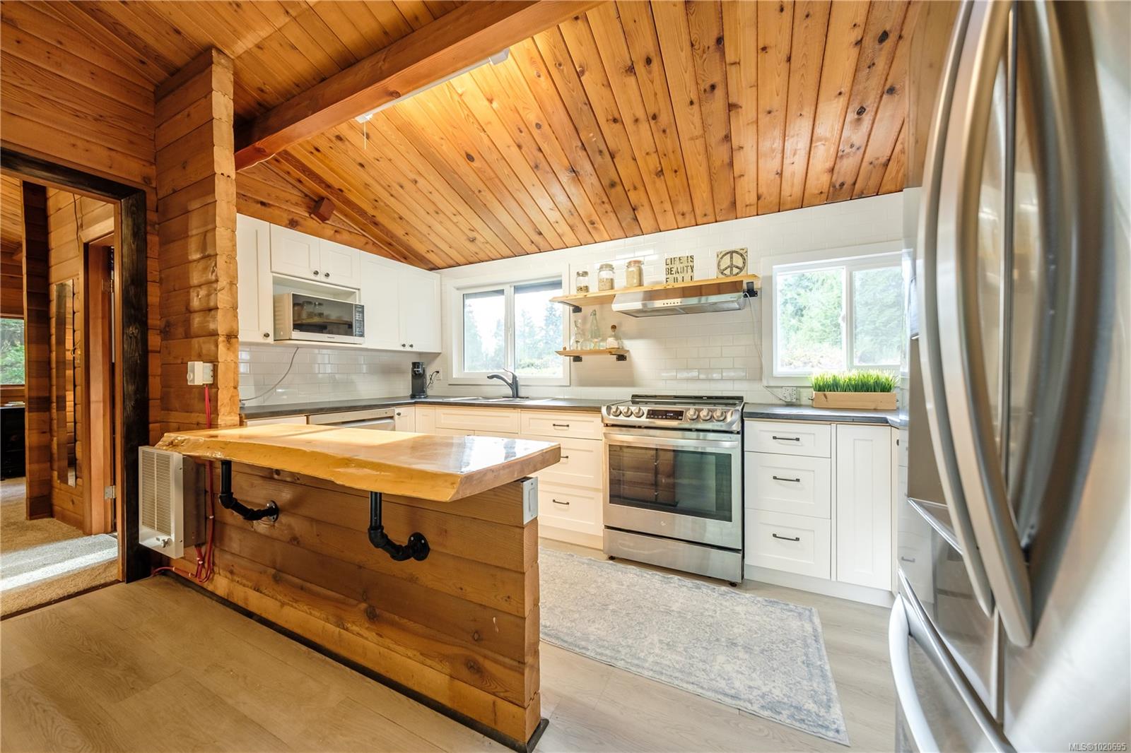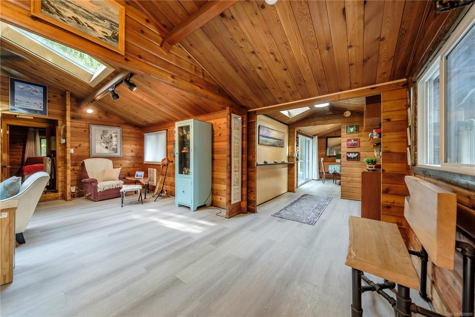 Charming and private Pan-Abode home on 2.1 acres, set toward the back of the property for a peaceful West Coast feel. This well-loved home features new skylights, upgraded windows, new flooring, two renovated bathrooms, a renovated kitchen, updated lighting, two high-efficiency heaters, and a newer woodstove (2022). The exterior has been fully painted, giving it a fresh cottage vibe. Practical updates include a new roof (approx. 2 years), septic pumped recently, insulated and heat-traced above-ground water lines, plus both a well and cistern. Enjoy great bedroom separation, warm wood interiors, and two decks overlooking the forested acreage. A detached 448 sq. ft. studio with toilet, sink, and two flexible rooms is ideal for a home office, artist’s studio, or workshop. A rare and beautifully treed property on Gabriola—come take a look.