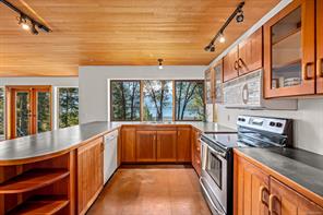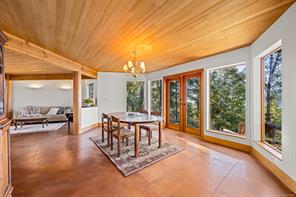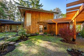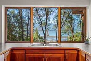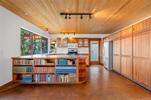 The open-concept layout is bathed with light from the bank of west-facing windows, with the ocean and mountain views framed by gary oaks and arbutus. The maple and radiant-heat polished concrete floors and custom cabinetry, create a spacious and warm feeling throughout, harmonizing with the surroundings.