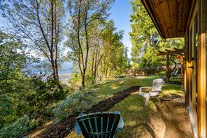The garden features roses, ornamental perennials, and fruit and nut trees, with a newly-rebuilt trellis surrounding the home. A private staircase leads down to a sheltered beach, perfect for summer swims.