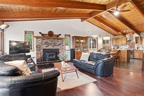 Discover rustic West Coast living at this charming lakeside retreat. Lush, vibrant gardens and fruit trees with an irrigation system—lead to your private dock with a shaded gazebo and lounge area, perfect for paddleboarding, boating, or enjoying peaceful mornings. The home offers a level entry, ideal for all ages and abilities, and features warm, inviting interiors with spacious living areas, a country-style kitchen, and a seamless flow to the outdoor deck. The bright, sun-filled interior opens to tranquil forest views and garden paths, perfect for summer entertaining. The walk-out lower level includes a fully self-contained suite with its own entrance and kitchen, ideal for guests or rental income. Additional highlights include a cedar sauna, a 3-phase digital water pump, and an 18’ x 22’ garage/workshop with new metal roof, attached 12’ x 20’ yellow cedar post-and-beam woodshed, and covered breezeway. A rare year-round lakeside opportunity.