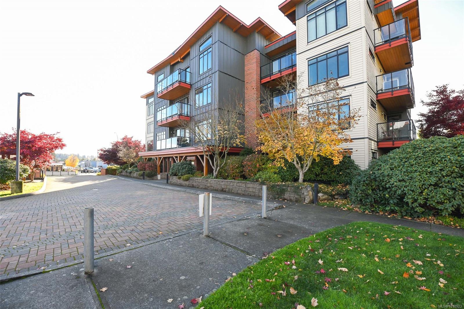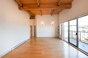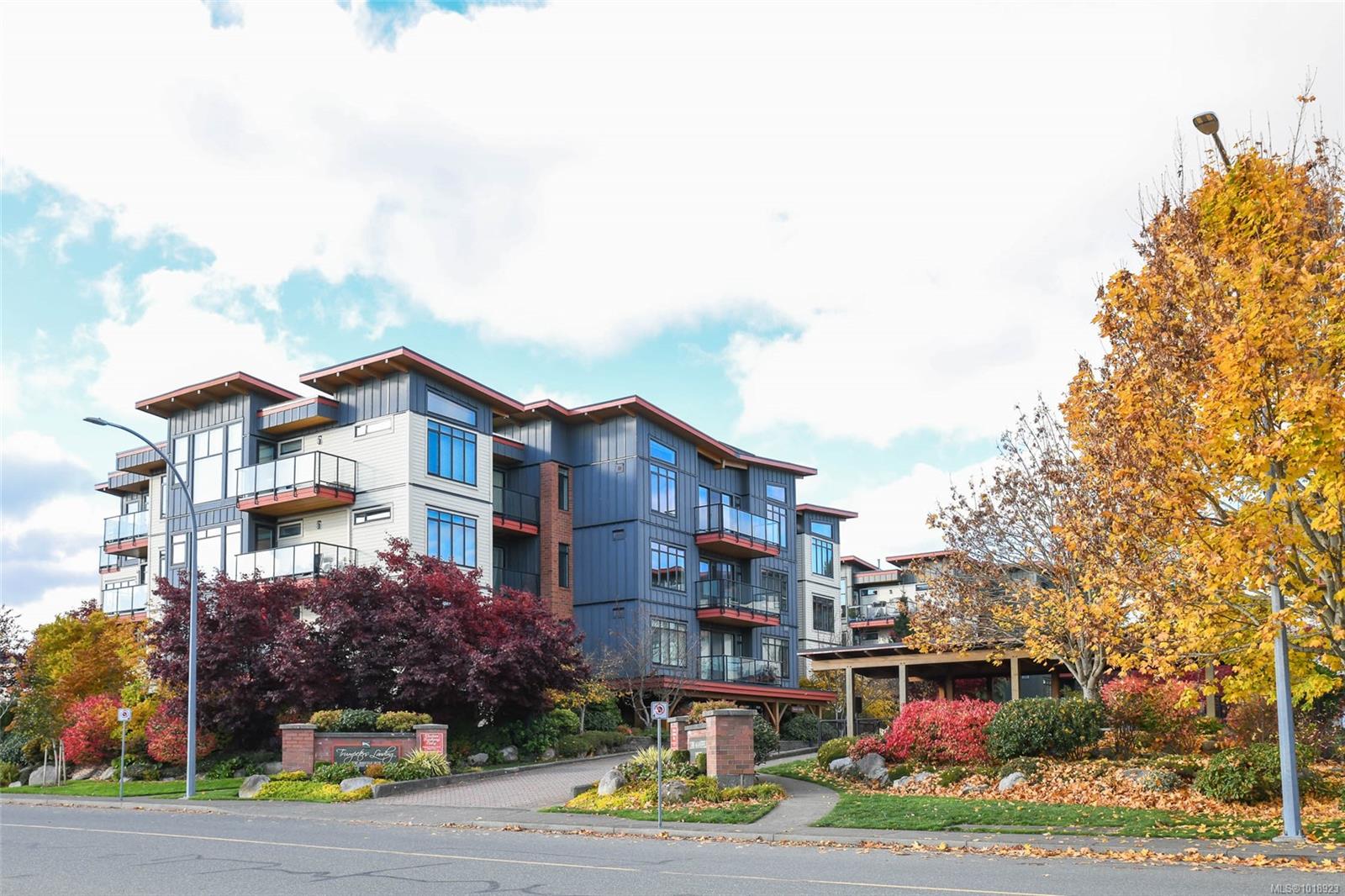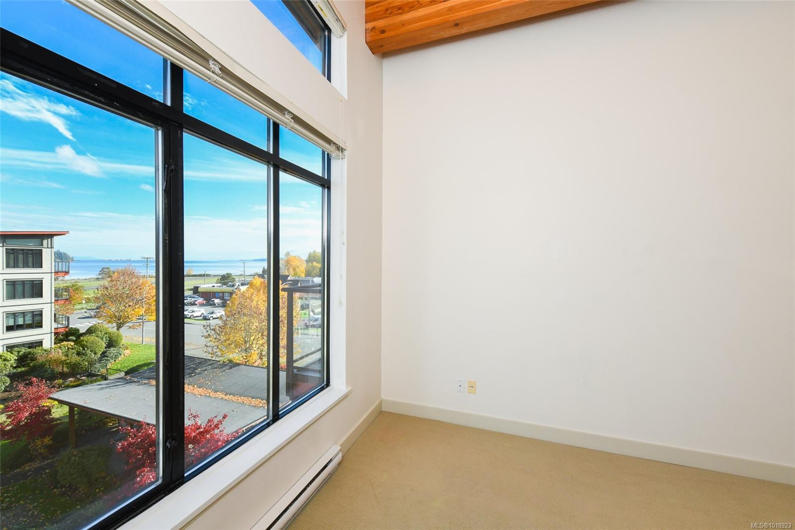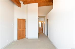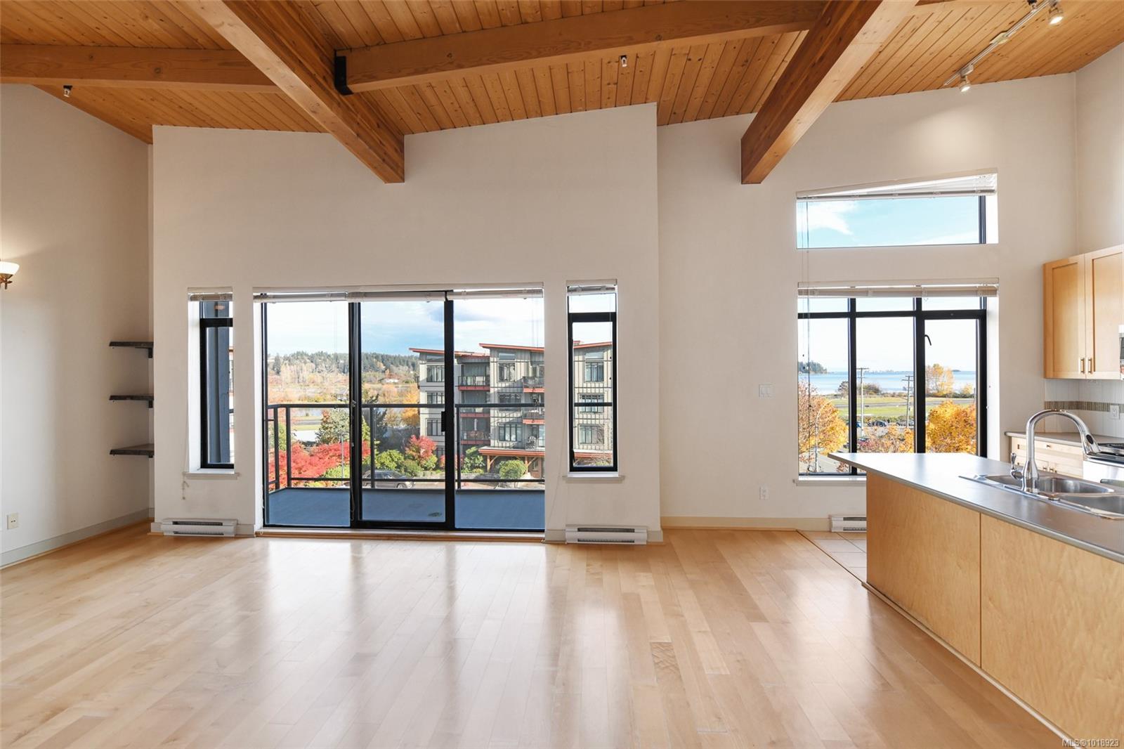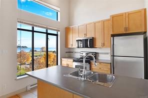 This top floor 2 bedroom, 2 bath condo at Trumpeter’s Landing boasts an ideal front and center location with stunning ocean and mountain views from the main living areas and bedrooms. Featuring beautiful over height wood beam ceilings and abundant windows, the home is filled with natural light throughout. The kitchen offers stainless steel appliances and an eat up bar for two, while the spacious primary bedroom includes a full ensuite and ample closet space. Additional highlights include a separate laundry/storage room and a large balcony perfect for enjoying the scenery. Just steps from the ocean, air park, and walking paths and close to all amenities, this home offers a central, coastal lifestyle. The pet friendly building features secured entry, a modern welcoming foyer, elevator, guest suite, underground parking, and a storage locker.
