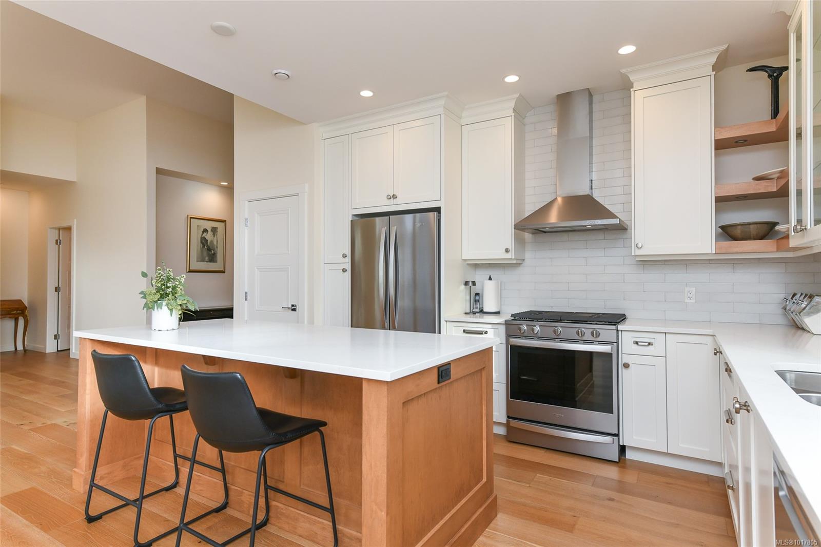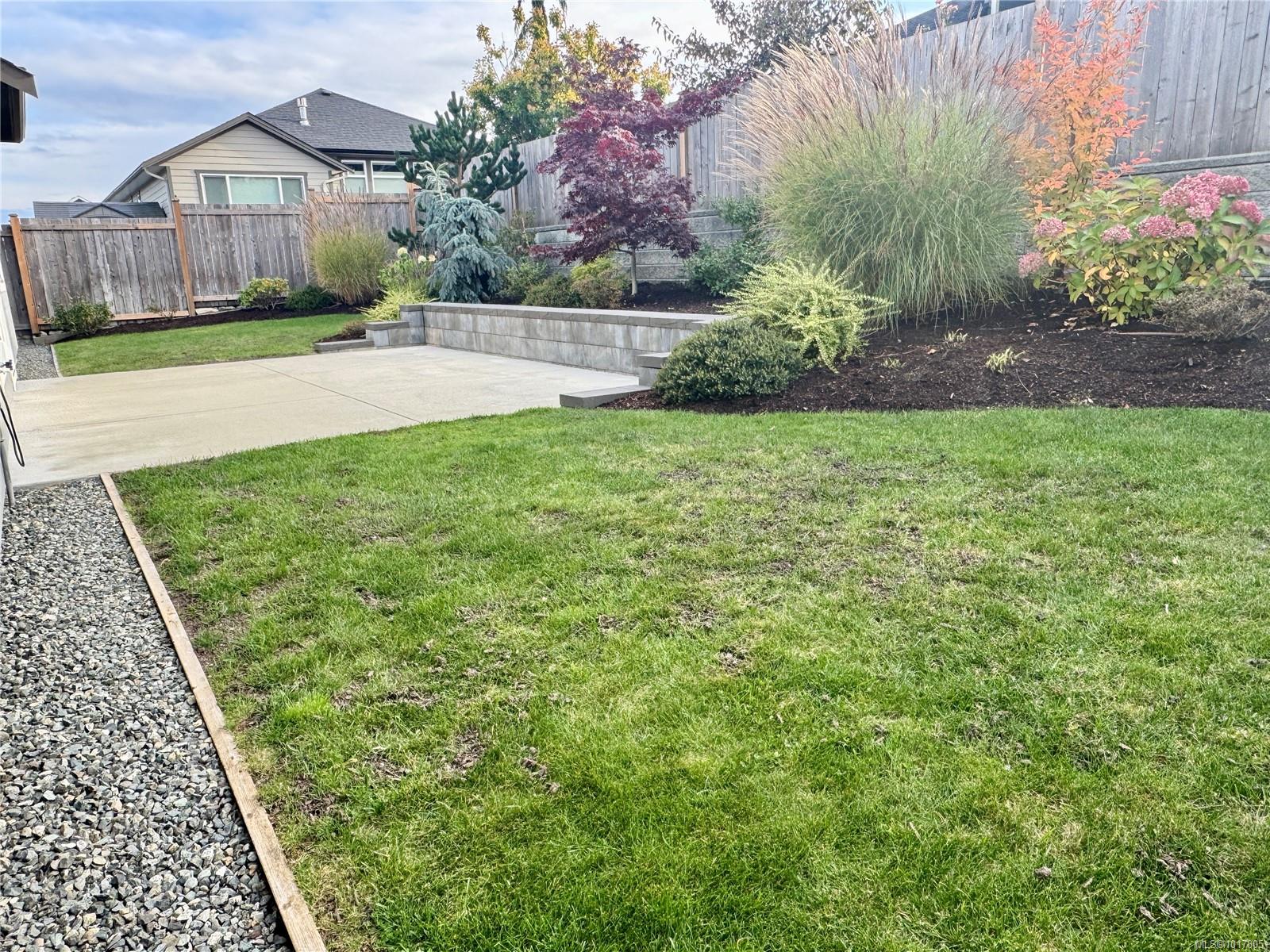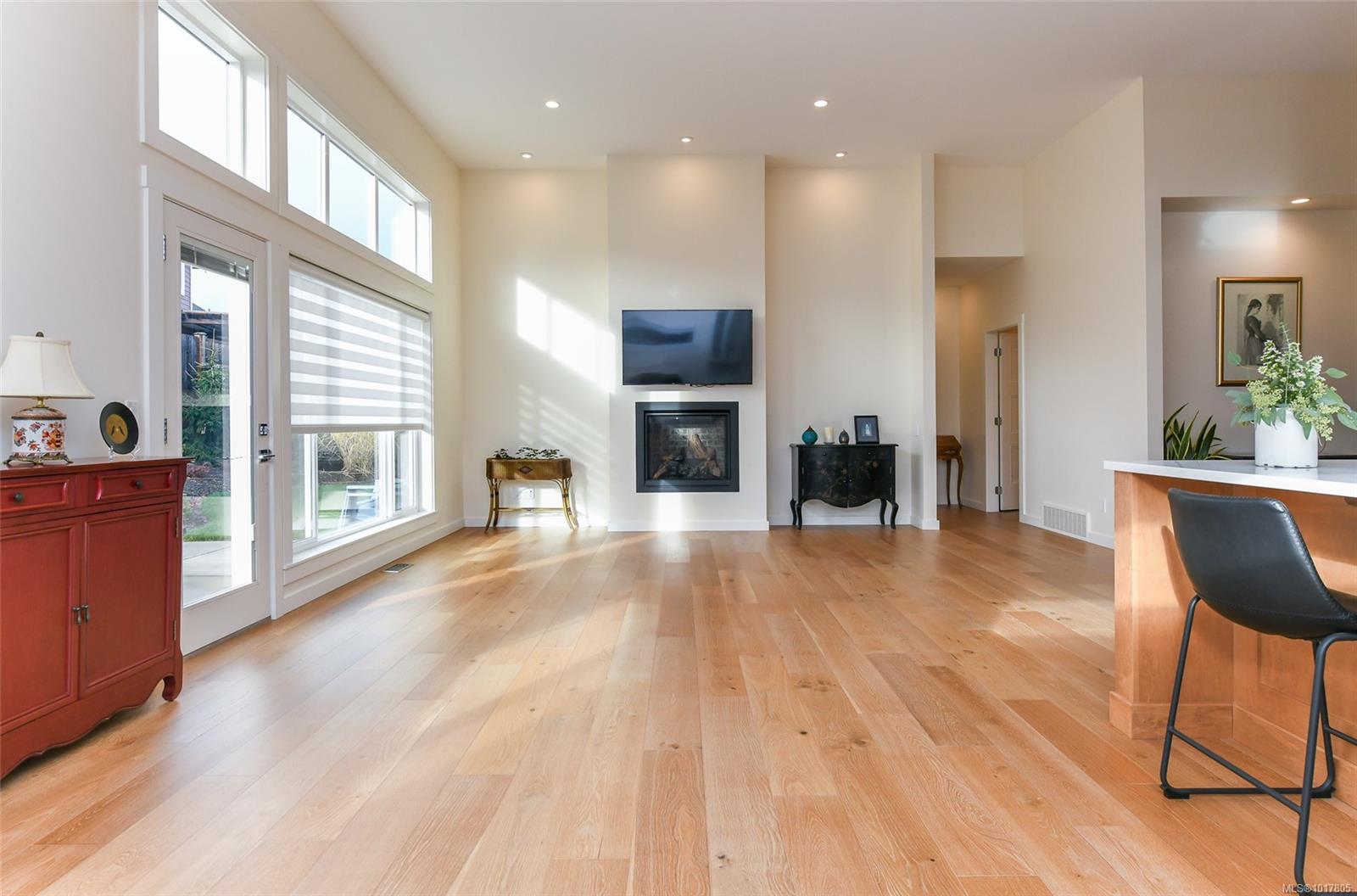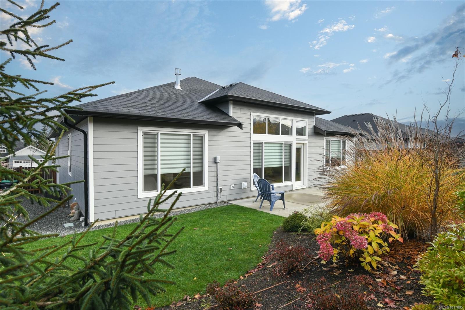 West Coast rancher with elegant detailed finishing. Main living area features full-window feature wall with approximately 12 foot ceilings and natural light. The home has an impressive kitchen with glass feature doors, timber shelving, indirect lighting, brick tiled backsplash, pantry and entertainment sized island with quartz countertops. Includes all appliances including gas range, microwave in the island, HRV, heat pump, solar assist panels (Energuide rating of 34) and under-height basement-crawl space for storage with access/stairs in garage. The master bedroom features 5 piece ensuite with heated tiles, sconces & walk-in closet with built in shelving. Professionally landscaped yard with 2 patios, mature foliage, and sturdy fence. Inside and out, this home has been very well loved, freshly painted with neutral white colour scheme, shows as brand new. 2020 custom home build. Walking trails past ponds nearby. This home is move-in ready, just turn the key and relax.