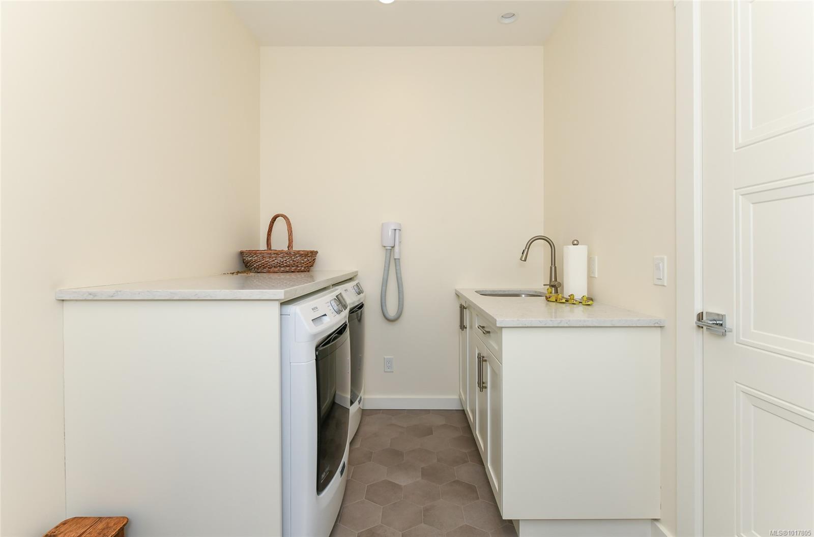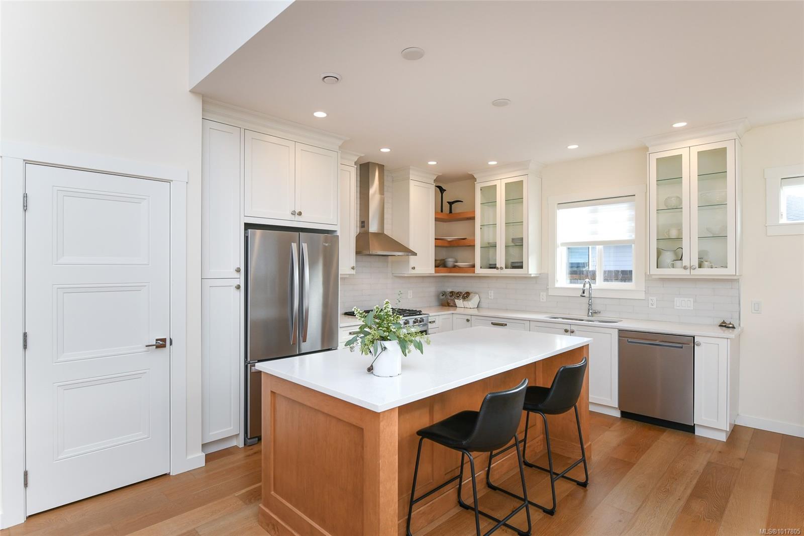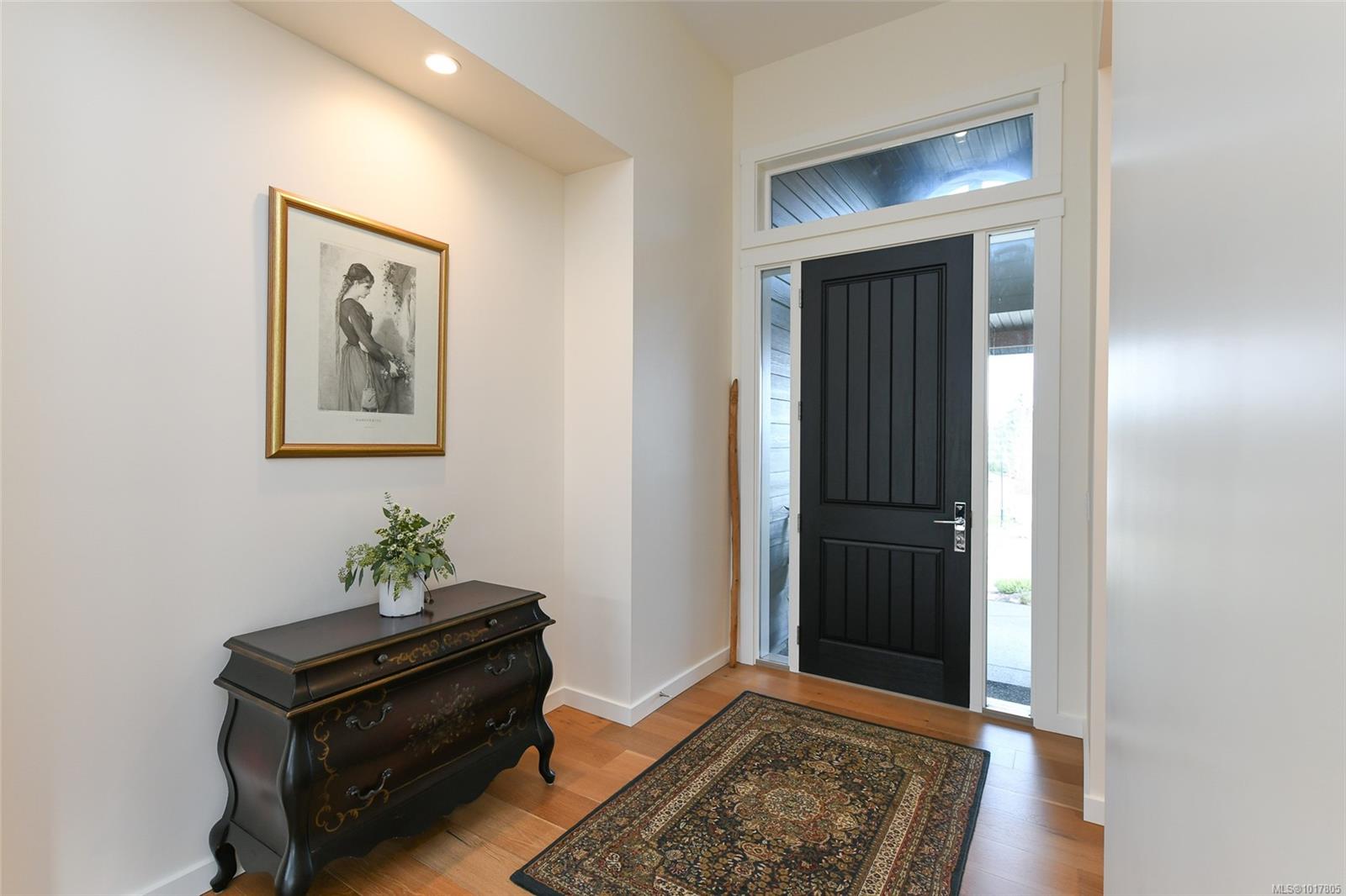 West Coast rancher with elegant detailed finishing. Main living area features full-window feature wall with approximately 12 foot ceilings and natural light. The home has an impressive kitchen with glass feature doors, timber shelving, indirect lighting, brick tiled backsplash, pantry and entertainment sized island with quartz countertops. Includes all appliances including gas range, microwave in the island, HRV, heat pump, solar assist panels (Energuide rating of 34) and under-height basement-crawl space for storage with access/stairs in garage. The master bedroom features 5 piece ensuite with heated tiles, sconces & walk-in closet with built in shelving. Professionally landscaped yard with 2 patios, mature foliage, and sturdy fence. Inside and out, this home has been very well loved, freshly painted with neutral white colour scheme, shows as brand new. 2020 custom home build. Walking trails past ponds nearby. This home is move-in ready, just turn the key and relax.