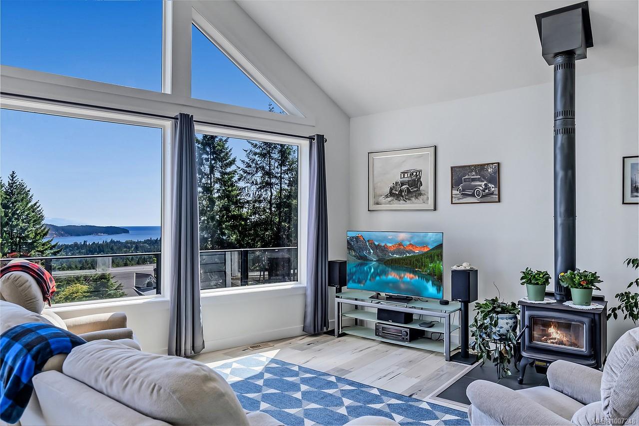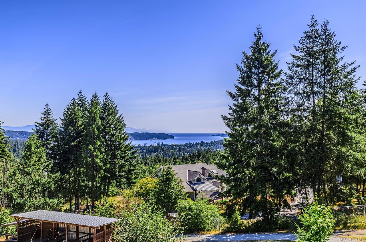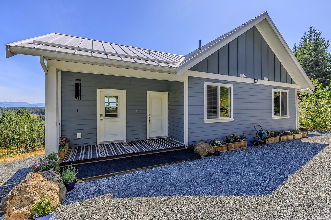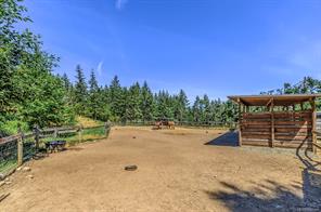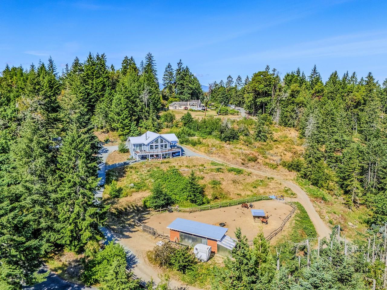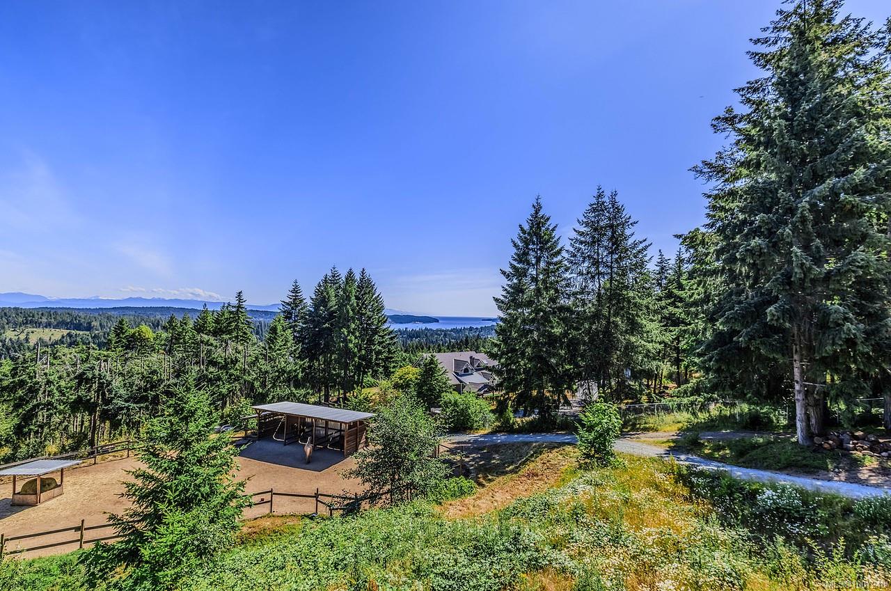 Just off the main paved Morello Road, a steep gravel driveway leads to a jewel of a property including the still like new 4-bed, 3-bath home. Perched on a 5.11-acre hillside property overlooking stunning views of Nanoose Bay, Salish Sea, & the Coastal mountains. The main floor features vaulted ceilings, picture windows, an open living/dining area with a cozy stove, a large kitchen with ample cabinetry, 3 bedrooms including the primary bedroom and 4pce ensuite, a 4pce main bath, laundry room, and a wrap around balcony with multiple seating areas. Downstairs is a bright 1-bed in-law suite with its own kitchen, den, flex room, 3-pce bath, laundry, and walkout patio. Additional features include an electric furnace with heat pump, metal roof, drilled well, septic & the remainder of the builders warranty. Ideal for horse lovers, the large yard includes a flat paddock area with shelter and covered storage. A unique property with incredible potential with great zoning and unforgettable views.