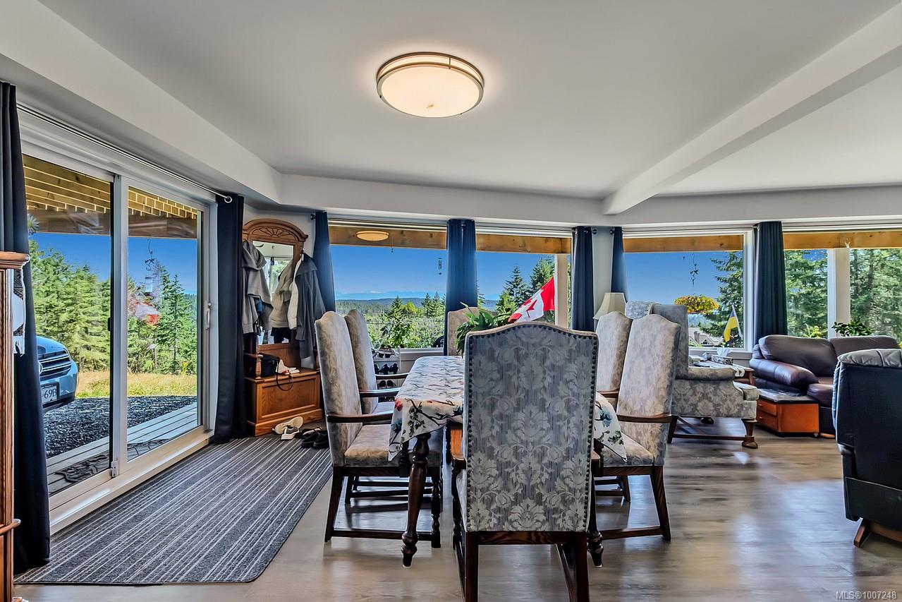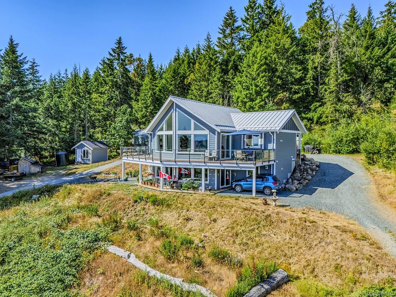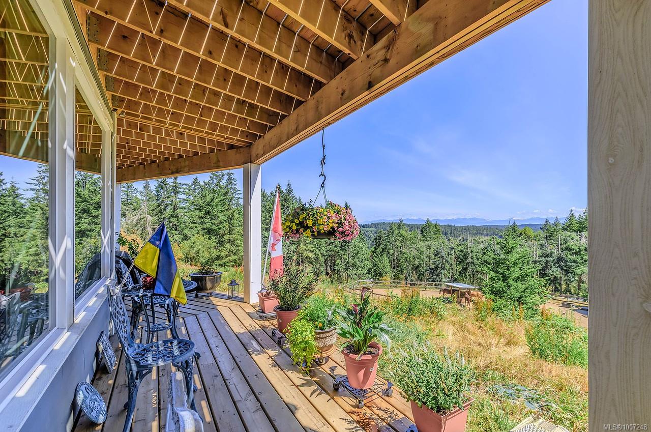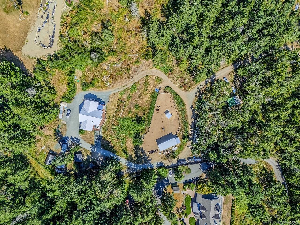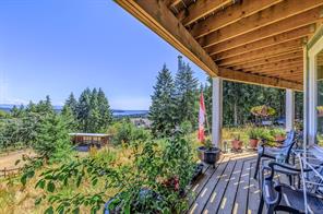 Just off the main paved Morello Road, a steep gravel driveway leads to a jewel of a property including the still like new 4-bed, 3-bath home. Perched on a 5.11-acre hillside property overlooking stunning views of Nanoose Bay, Salish Sea, & the Coastal mountains. The main floor features vaulted ceilings, picture windows, an open living/dining area with a cozy stove, a large kitchen with ample cabinetry, 3 bedrooms including the primary bedroom and 4pce ensuite, a 4pce main bath, laundry room, and a wrap around balcony with multiple seating areas. Downstairs is a bright 1-bed in-law suite with its own kitchen, den, flex room, 3-pce bath, laundry, and walkout patio. Additional features include an electric furnace with heat pump, metal roof, drilled well, septic & the remainder of the builders warranty. Ideal for horse lovers, the large yard includes a flat paddock area with shelter and covered storage. A unique property with incredible potential with great zoning and unforgettable views.
