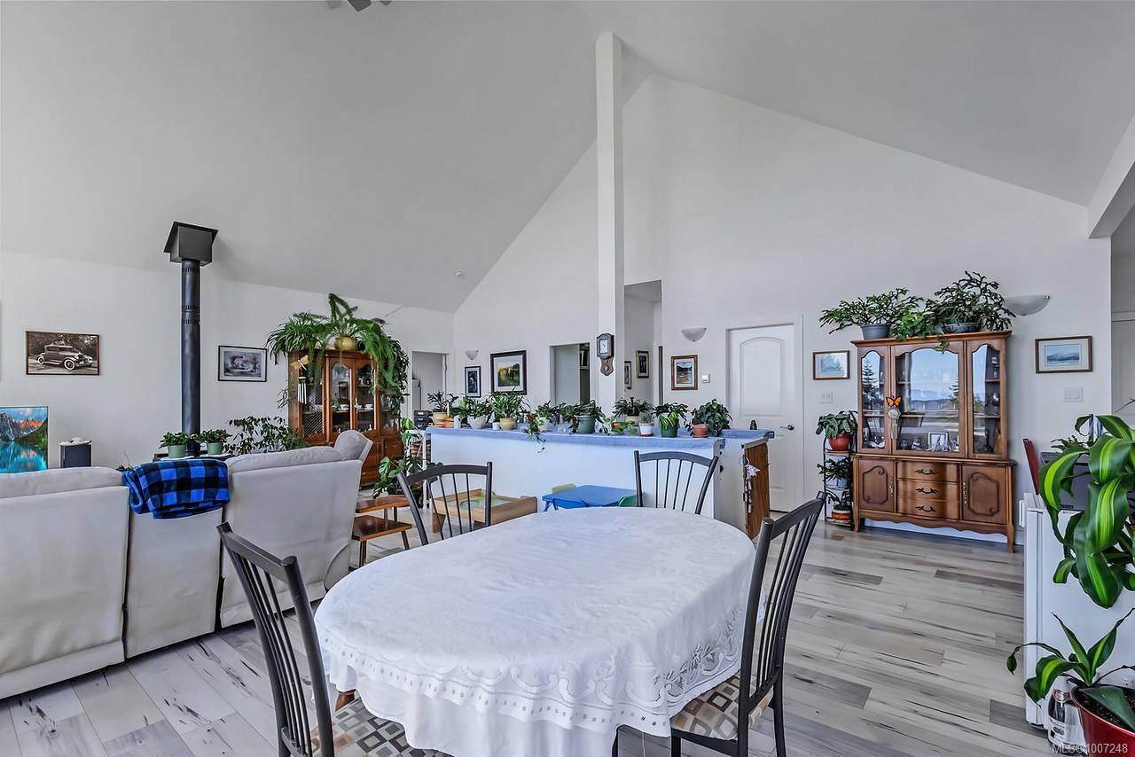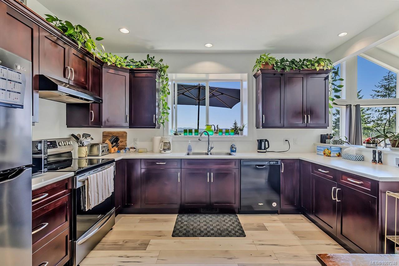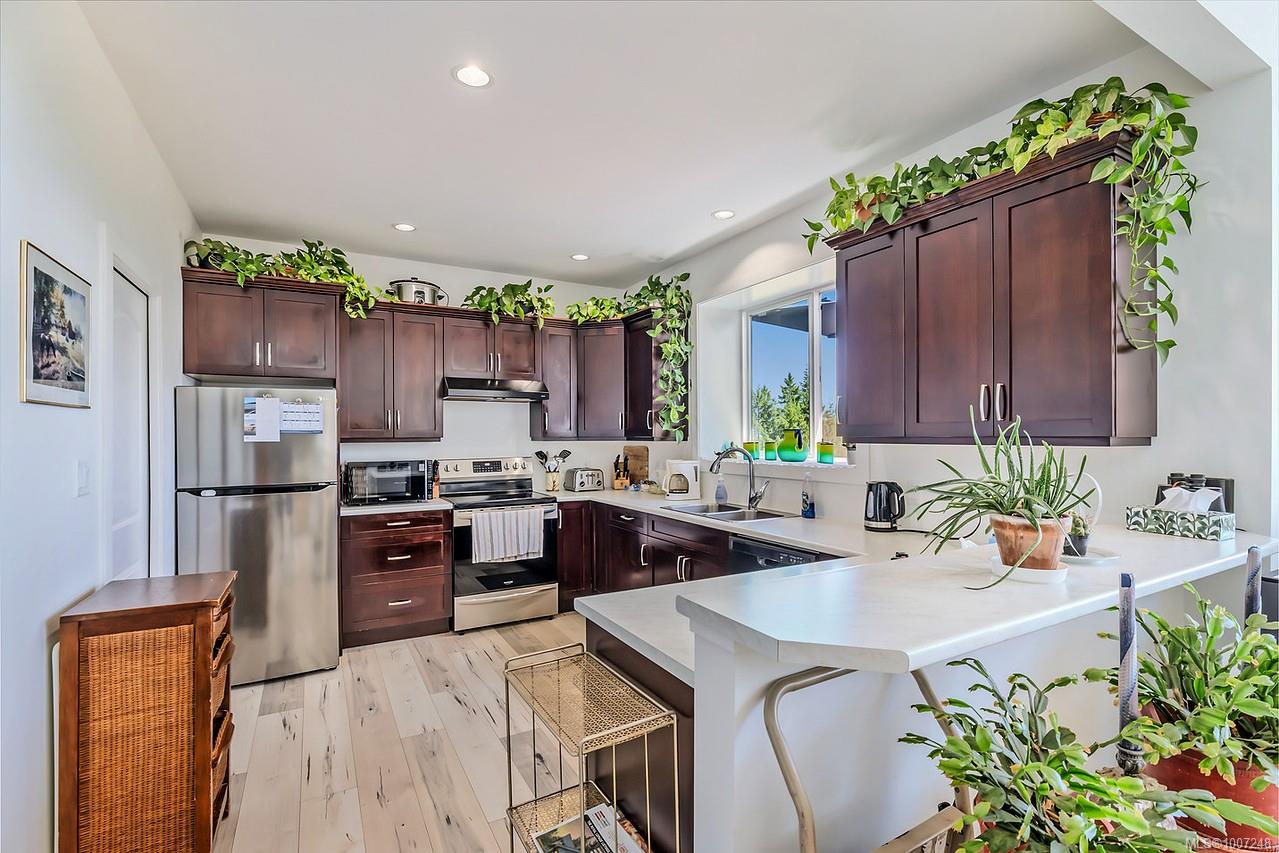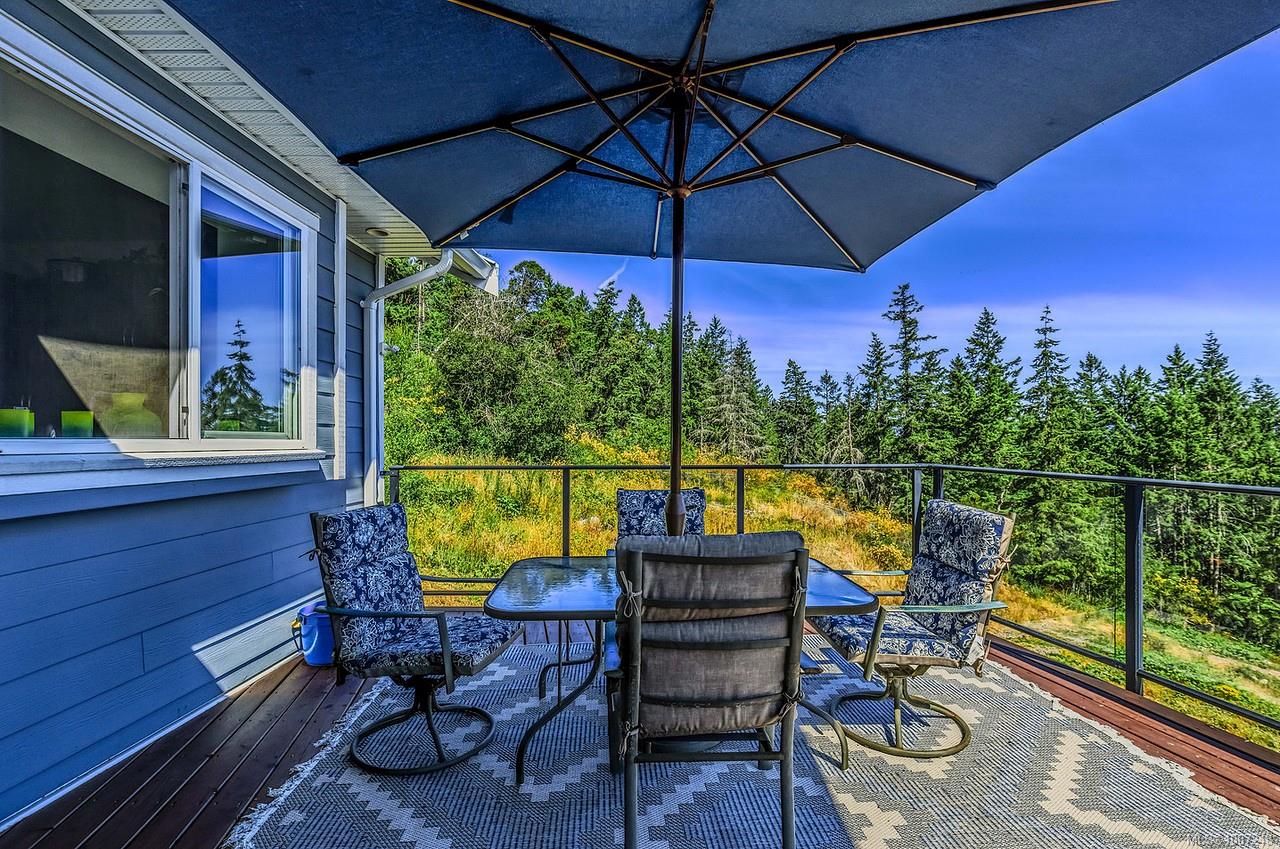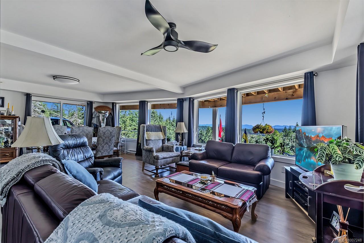 Just off the main paved Morello Road, a steep gravel driveway leads to a jewel of a property including the still like new 4-bed, 3-bath home. Perched on a 5.11-acre hillside property overlooking stunning views of Nanoose Bay, Salish Sea, & the Coastal mountains. The main floor features vaulted ceilings, picture windows, an open living/dining area with a cozy stove, a large kitchen with ample cabinetry, 3 bedrooms including the primary bedroom and 4pce ensuite, a 4pce main bath, laundry room, and a wrap around balcony with multiple seating areas. Downstairs is a bright 1-bed in-law suite with its own kitchen, den, flex room, 3-pce bath, laundry, and walkout patio. Additional features include an electric furnace with heat pump, metal roof, drilled well, septic & the remainder of the builders warranty. Ideal for horse lovers, the large yard includes a flat paddock area with shelter and covered storage. A unique property with incredible potential with great zoning and unforgettable views.