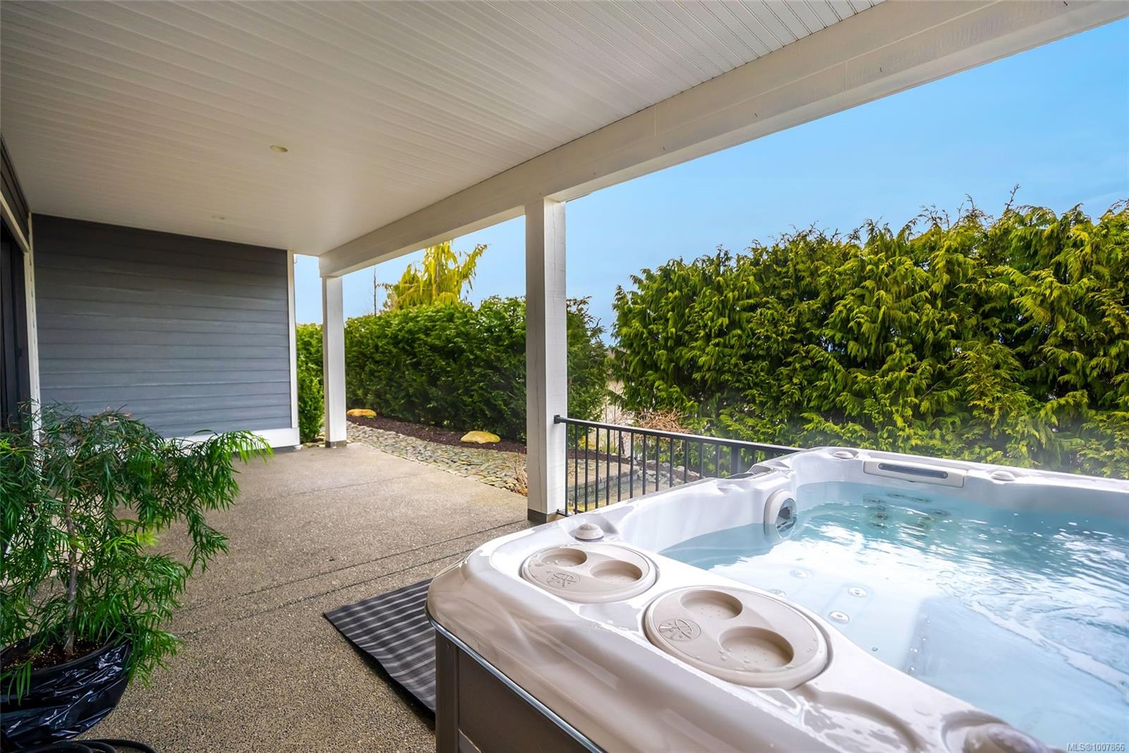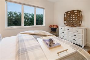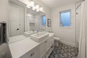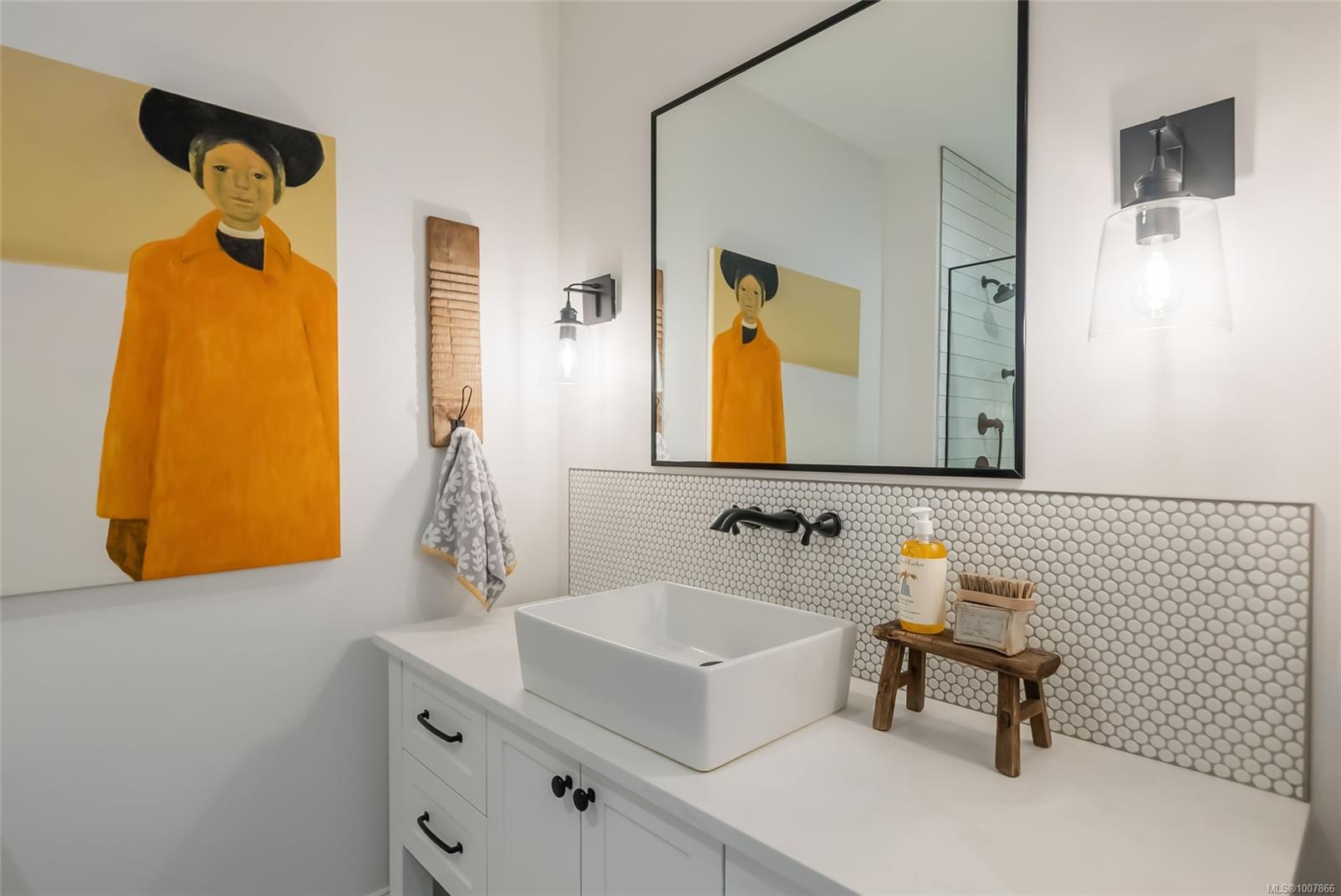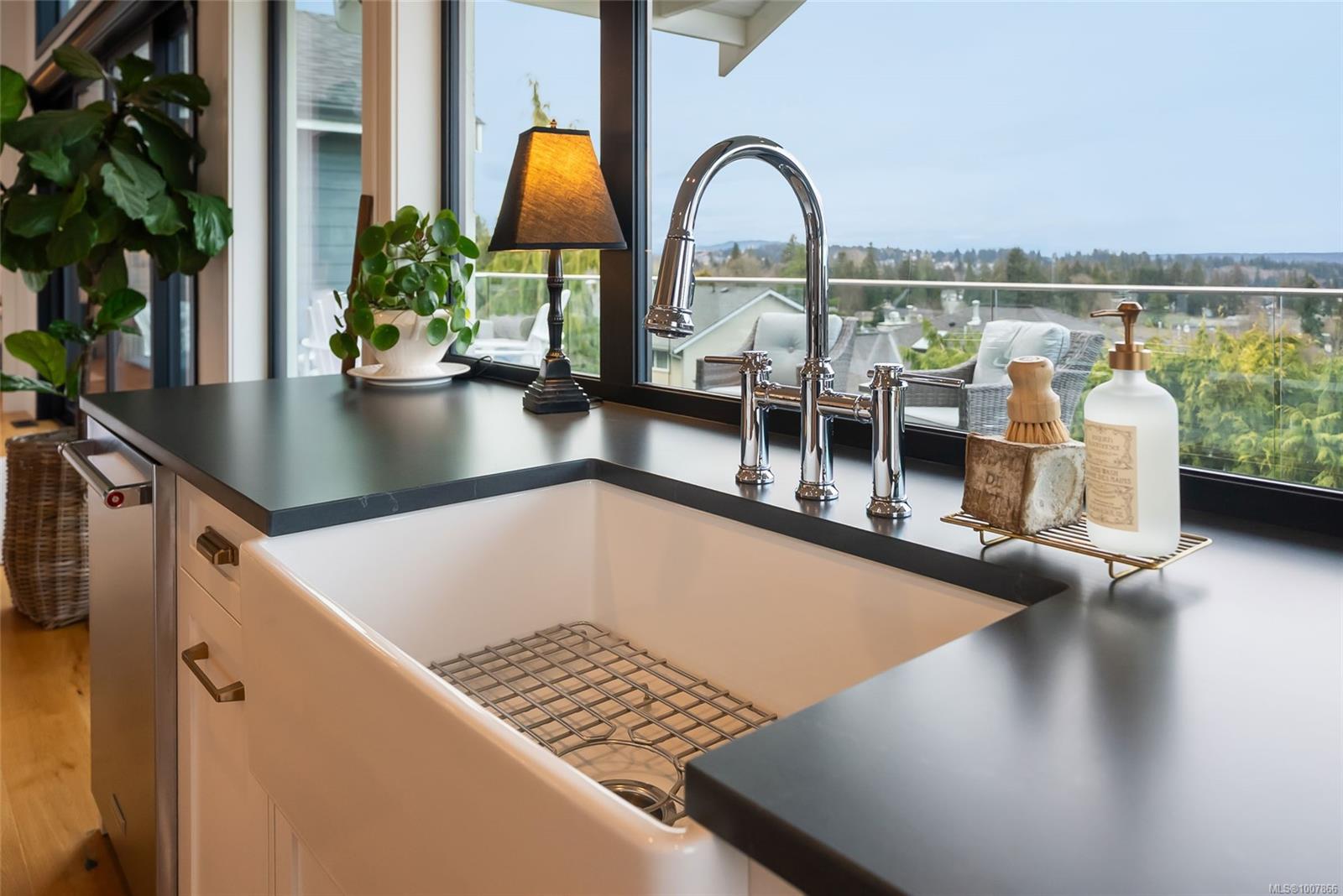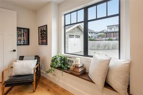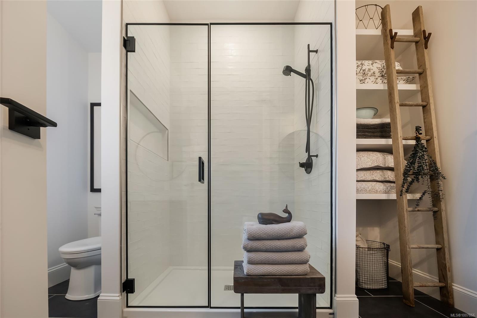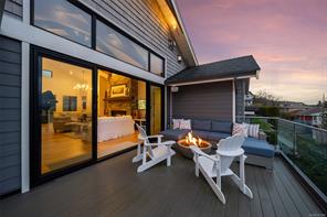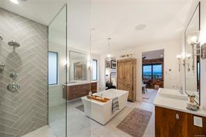 This breathtaking custom-built home with stunning panoramic ocean views was designed with intention and finished to perfection by Twelve Oaks Construction. The living room wows with vaulted ceilings showcasing old-growth custom curved exposed trusses and a sleek linear gas fireplace framed in real stone. The kitchen is a chef’s paradise, with a shiplap ceiling, an oversized quartz-topped island, a full-size fridge and freezer, a Wolf six-burner dual-fuel range, a glass-front fridge, and a walk-in pantry. The primary suite feels straight out of a design magazine, featuring a reclaimed brick accent wall that frames the ocean view window, a spa-inspired ensuite with a walk-in tiled shower and a freestanding soaker tub.