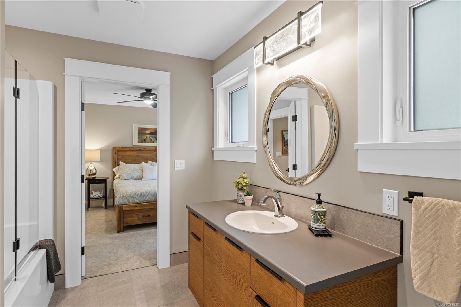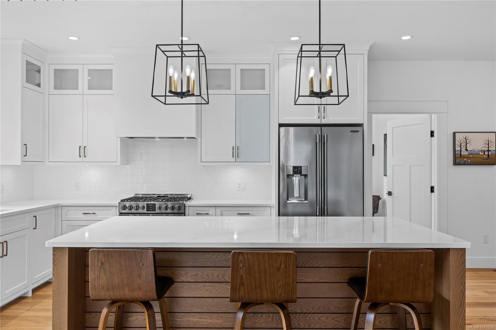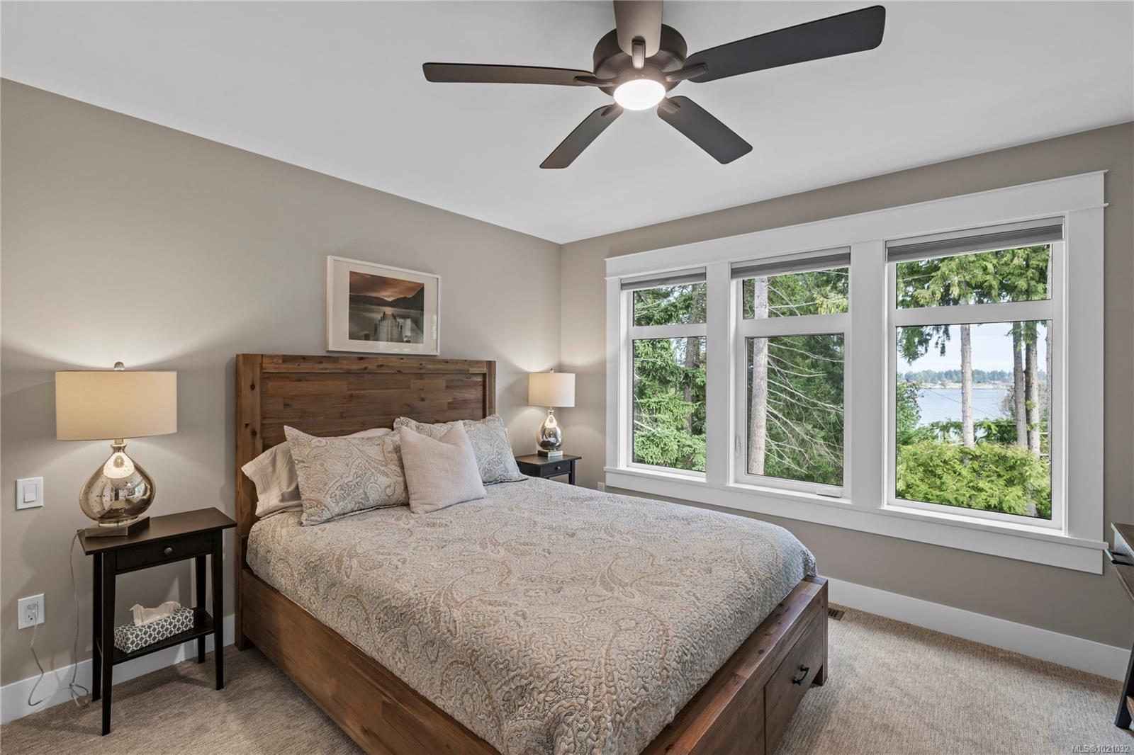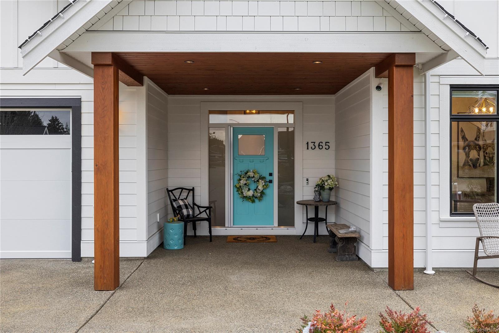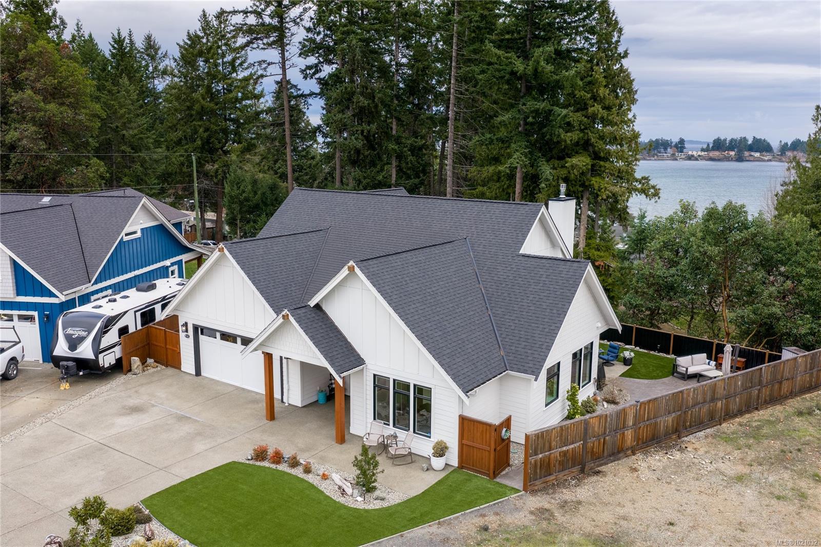 With refined farmhouse styling, ocean views, and lock and go ease, this almost-new home is a standout. The main level features a warm wood and white kitchen with designer lighting, a generous walk in pantry, and tranquil views over a babbling water feature. The dining area opens to the backyard, while the living room offers a gas fireplace and custom cabinetry. The spacious primary suite includes a large walk in closet, extra storage, and a beautifully appointed ensuite with a tile shower. Upstairs, an inviting family room with sundeck access, guest bedroom, and full five piece bath creates a private haven for visitors or hobbies. Outside, the low maintenance landscape with artificial turf, rock gardens, aluminum fencing, and a concrete pad ready for a future shed delivers all the polish without the weekend workload. The location is amazing. Stroll an arbutus lined path to Craig Bay beach, with Englishman River trails and Resort Drive dining and spas all close by.