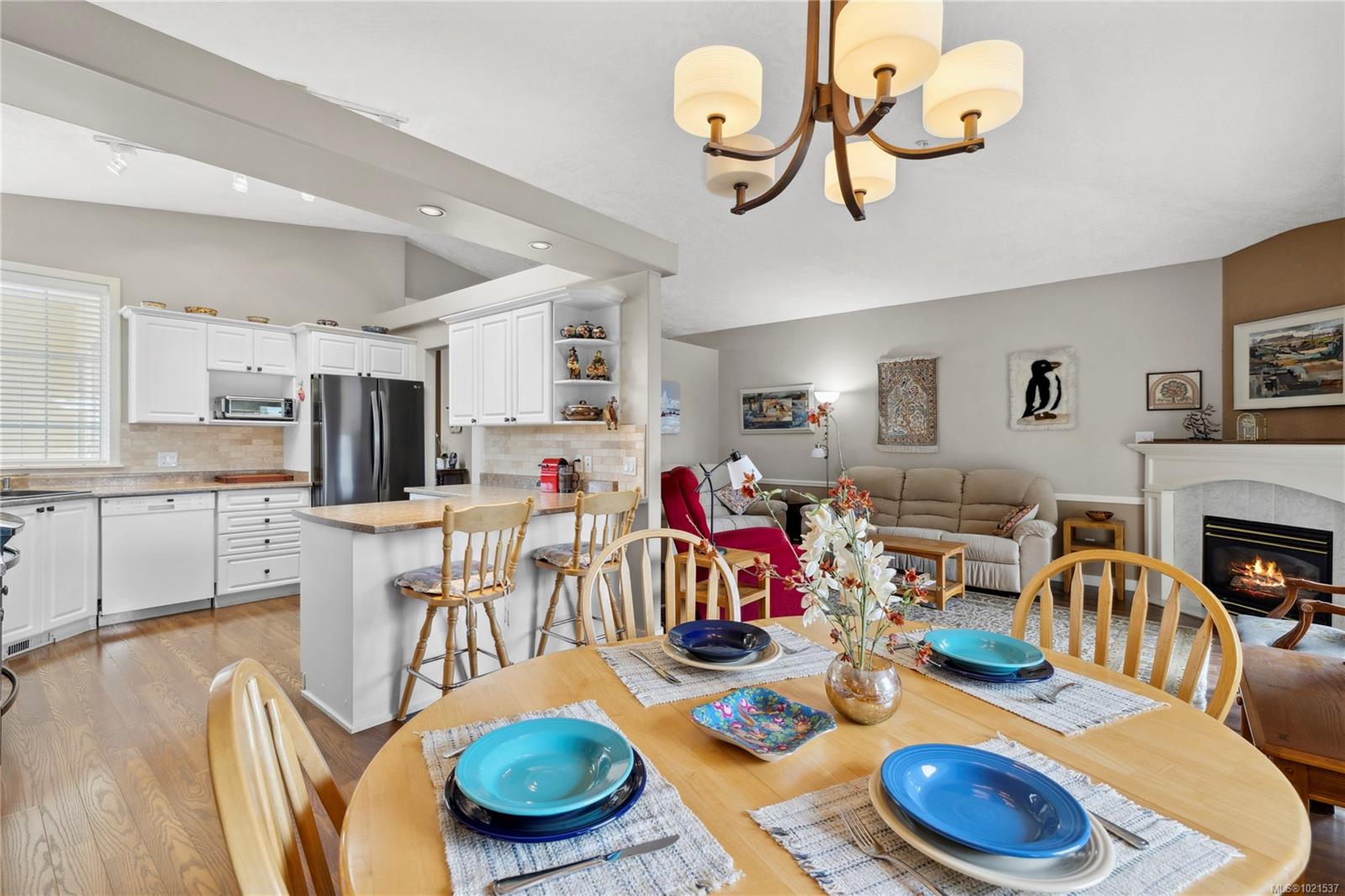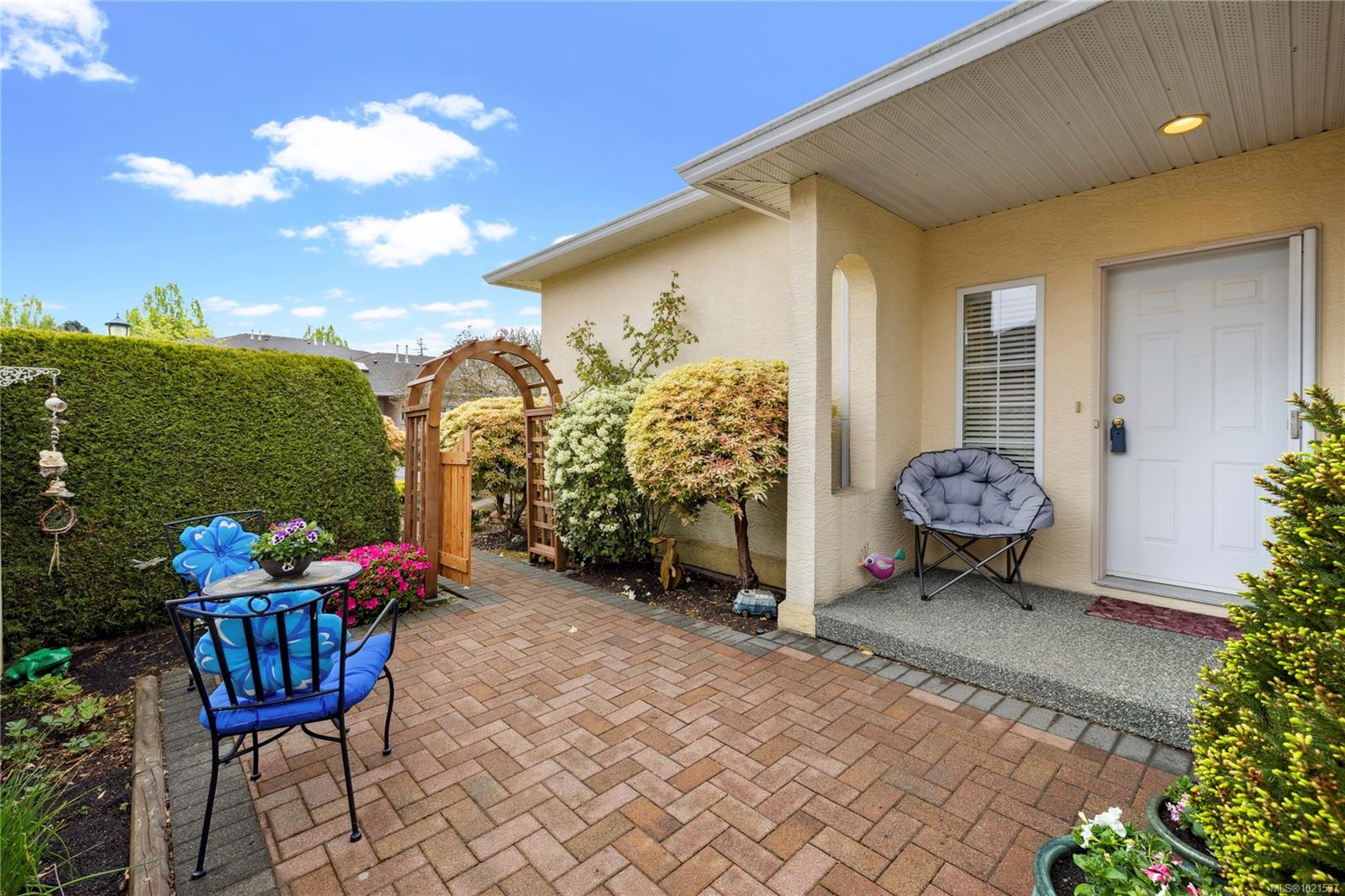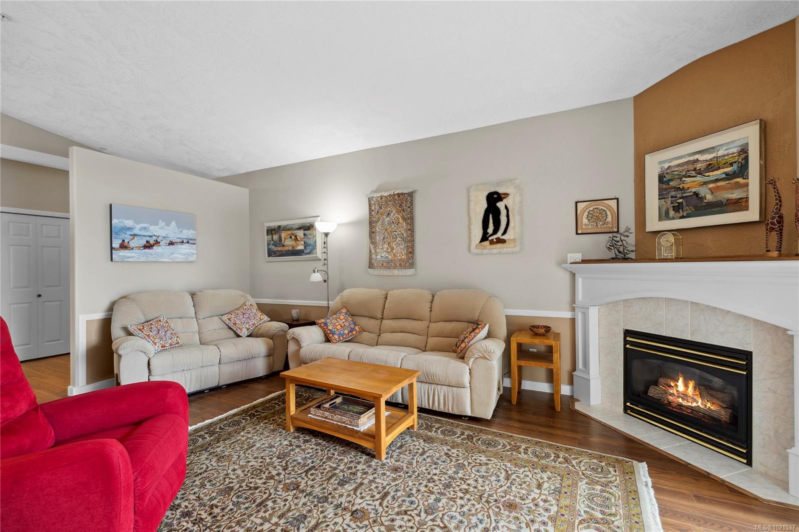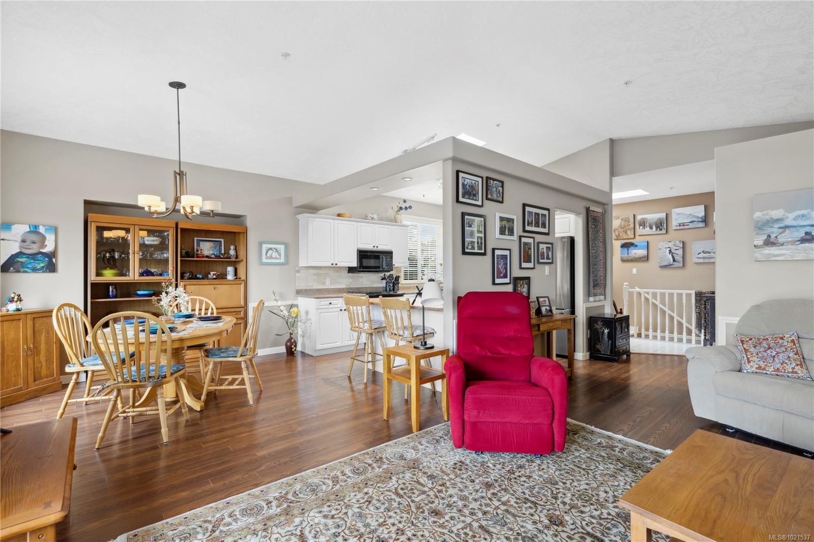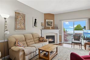 Located in the sought-after 55+ community of The Terraces, this main level entry townhouse with a walk-out basement offers a functional and comfortable layout in a prime North Nanaimo location close to all amenities. The open-concept main floor features a bright living room with gas fireplace, dining area, and kitchen with white cabinetry, an eating bar, and four appliances. Step outside to an ocean view deck off the living room or relax on the private front patio. The main level includes two bedrooms, including a primary with dual closets and a four-piece ensuite, plus a three-piece bathroom and laundry room. The lower level offers a large family room with wet bar, a third bedroom, and a three-piece bathroom—ideal for guests. A covered patio and expansive unfinished storage area add flexibility and convenience. The complex offers a great sense of community, a clubhouse and allows one dog or cat up to 12kg. All data and measurements are approx and must be verified if fundamental.