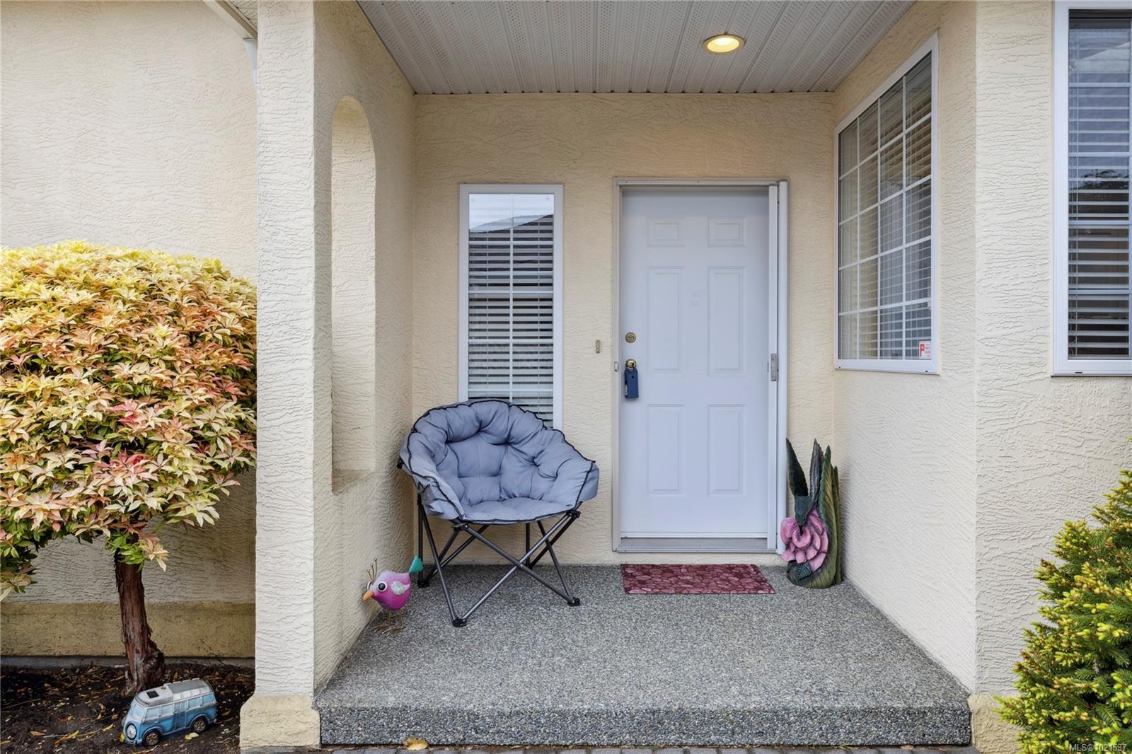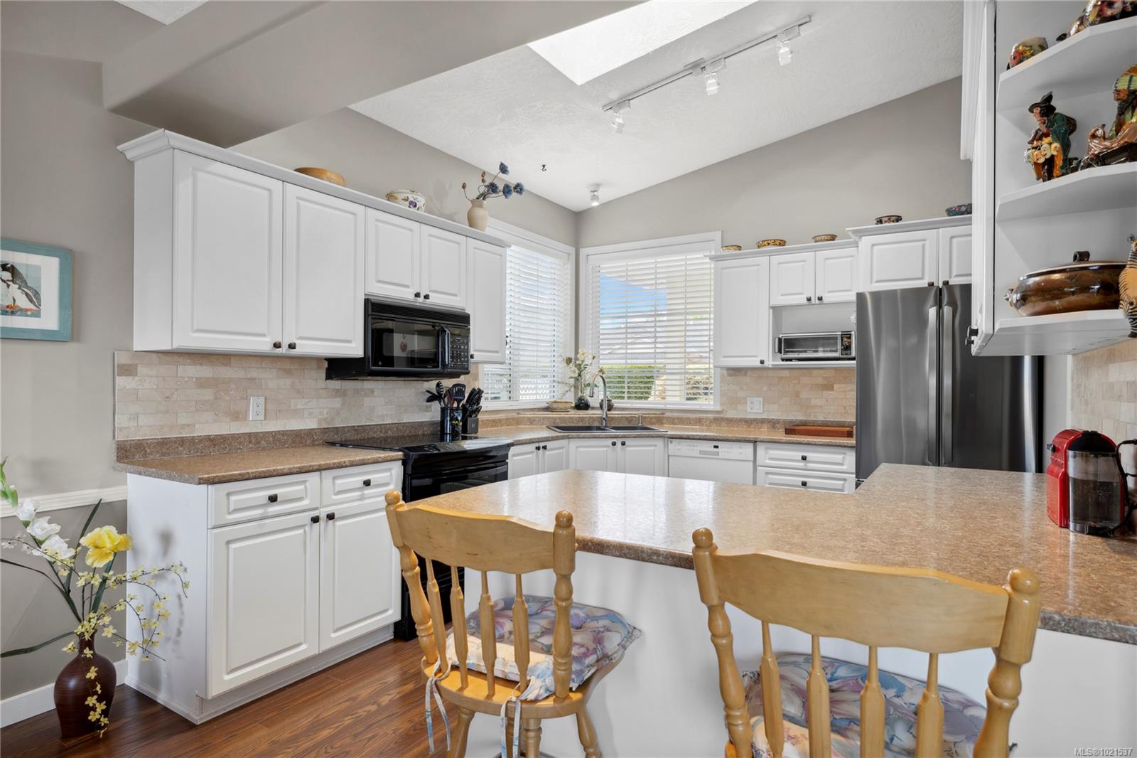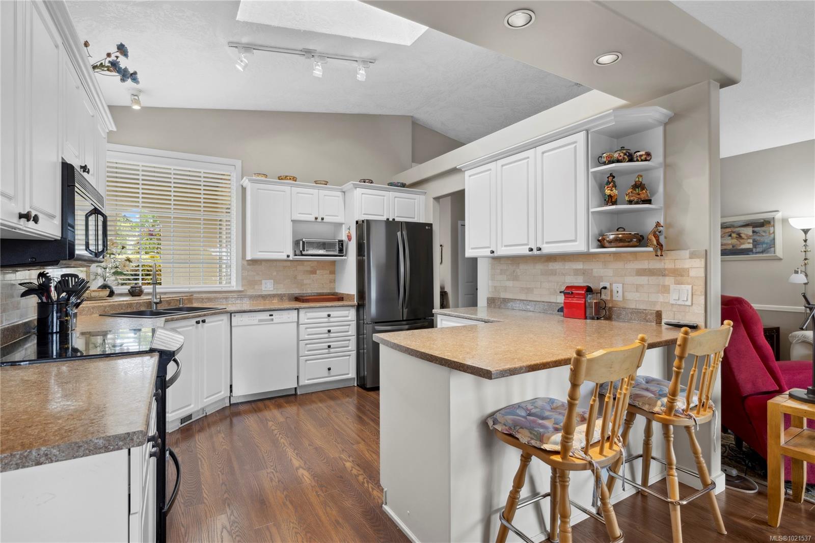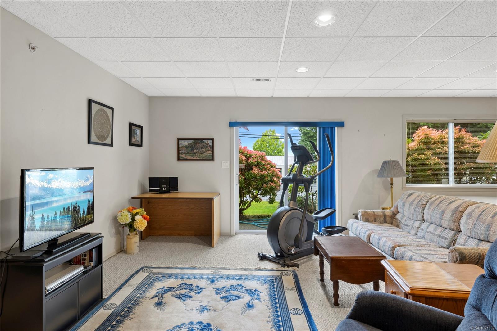 Located in the sought-after 55+ community of The Terraces, this main level entry townhouse with a walk-out basement offers a functional and comfortable layout in a prime North Nanaimo location close to all amenities. The open-concept main floor features a bright living room with gas fireplace, dining area, and kitchen with white cabinetry, an eating bar, and four appliances. Step outside to an ocean view deck off the living room or relax on the private front patio. The main level includes two bedrooms, including a primary with dual closets and a four-piece ensuite, plus a three-piece bathroom and laundry room. The lower level offers a large family room with wet bar, a third bedroom, and a three-piece bathroom—ideal for guests. A covered patio and expansive unfinished storage area add flexibility and convenience. The complex offers a great sense of community, a clubhouse and allows one dog or cat up to 12kg. All data and measurements are approx and must be verified if fundamental.