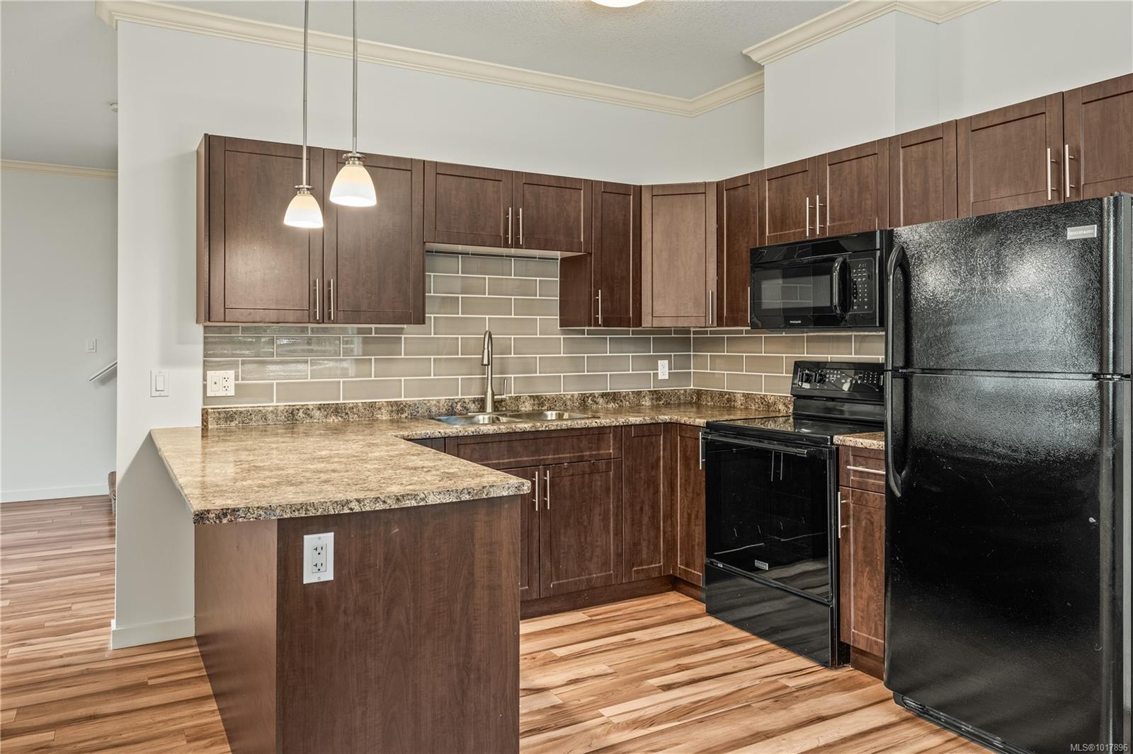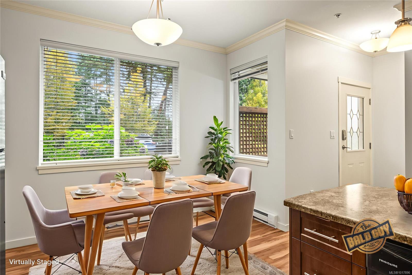 Welcome to Blackcomb Ridge — a quiet, well-kept community in Nanaimo’s desirable Diver Lake area. Freshly painted and move-in ready, this beautifully maintained 1,094 sq.ft. townhome offers the comfort of a single-family home with the ease of strata living. The main level features an open, light-filled layout with high ceilings, durable laminate floors, and a modern kitchen with espresso cabinetry, tile backsplash, and bar seating — perfect for casual dining or entertaining. Upstairs are three spacious bedrooms, a laundry area, and a serene primary suite with a walk-in closet, ensuite, and views of surrounding greenery. Pet-friendly (two allowed, no size restriction) and ideally located near schools, shopping, trails, and Beban Park, this inviting home delivers space, comfort, and convenience in one of Nanaimo’s most sought-after neighbourhoods.