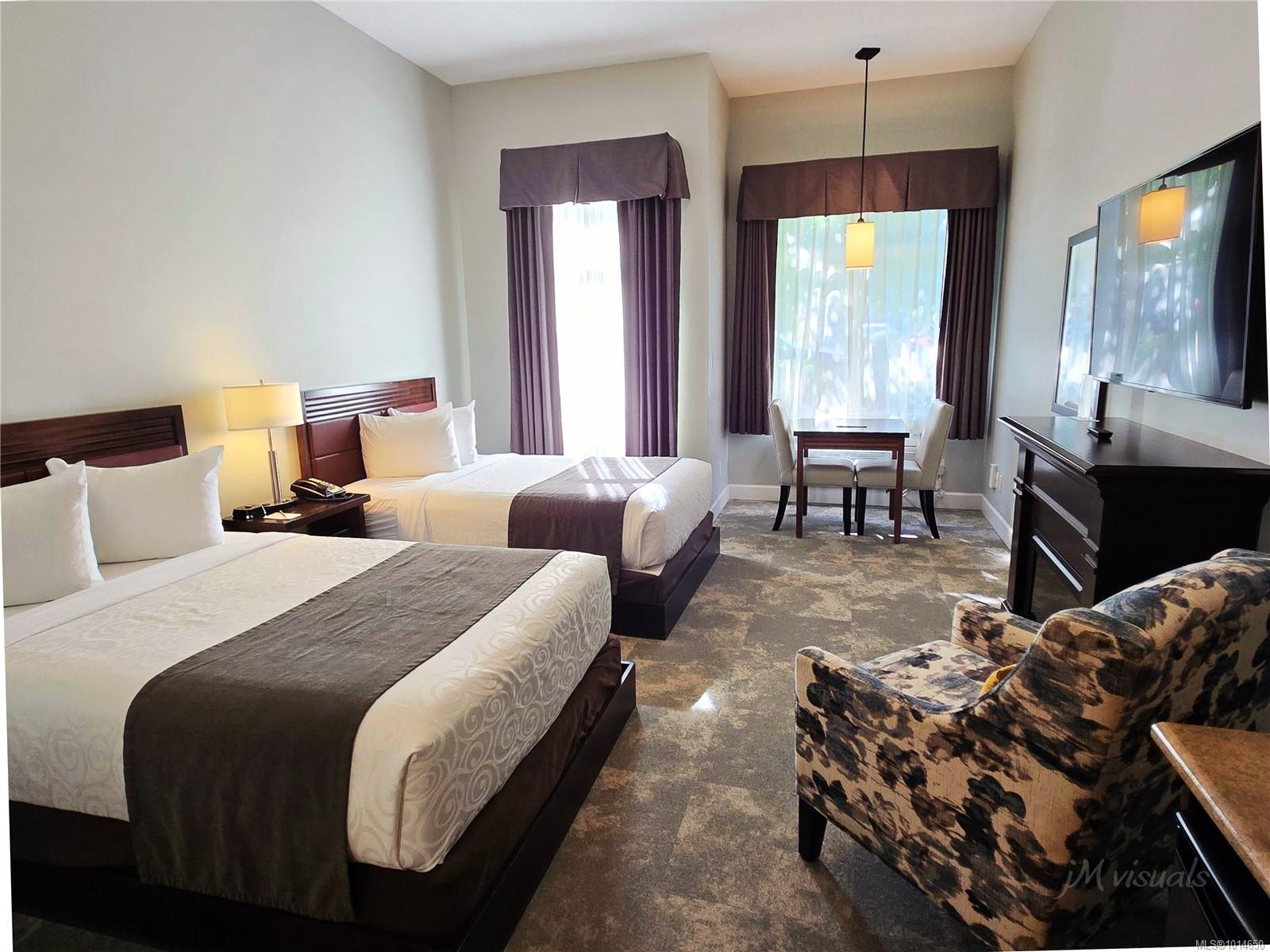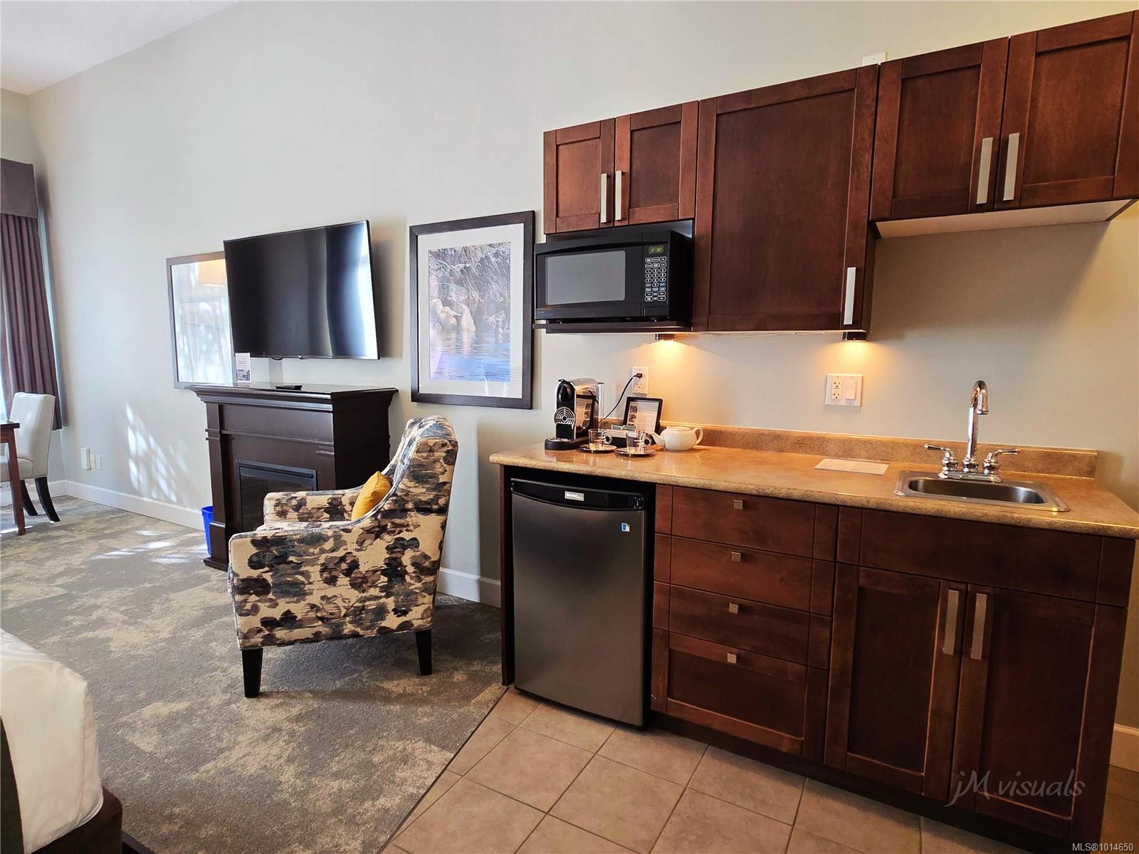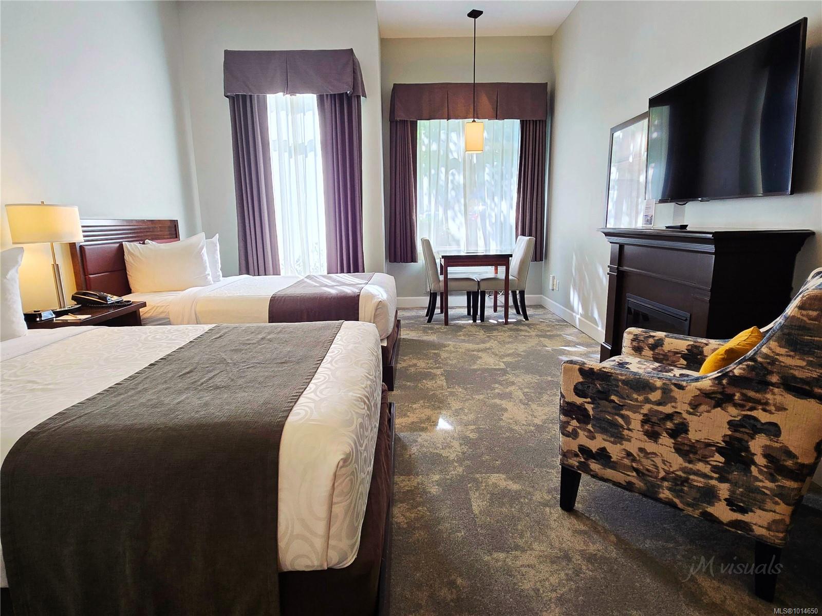 Experience West Coast charm and refined comfort in this luxurious main-floor corner suite at the Old House Hotel & Spa in Courtenay. This is a rare chance to own ALL 4 QUARTERS of the same unit – enjoy up to 3 weeks’ personal use monthly, with the rest earning income via professional hotel management. Vaulted ceilings and expansive windows create a bright, airy retreat, fully furnished with upscale finishes. Relax by the fireplace, prepare light meals in the petite kitchen, and unwind in the spa inspired bath with walk in shower and separate tub. Resort amenities include a heated pool, hot tub, Ohspa, fitness gym, EV charging, and lush grounds. Pet friendly, with underground parking and easy access to the riverway trail, shopping, dining, golf, beaches, Mt. Washington, and Comox Airport. This low maintenance getaway blends luxury, convenience, and revenue potential. Strata Fee: $591.40/month; Assoc. Fee: $872.68/month; GST applies; not for full time living.