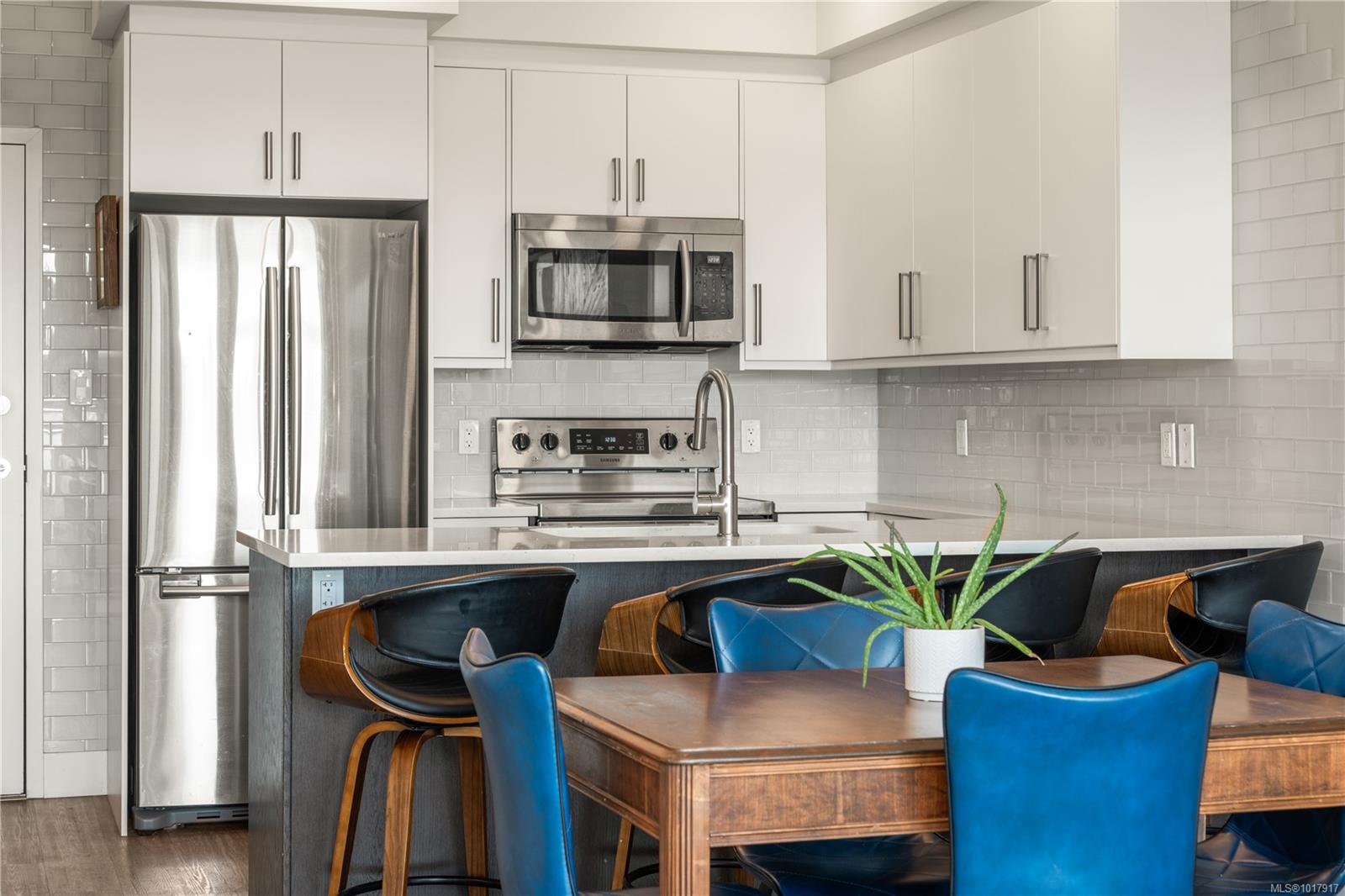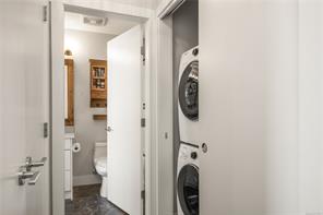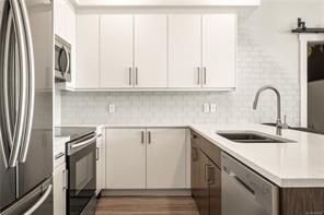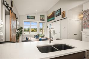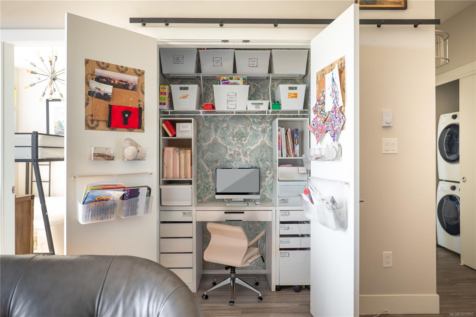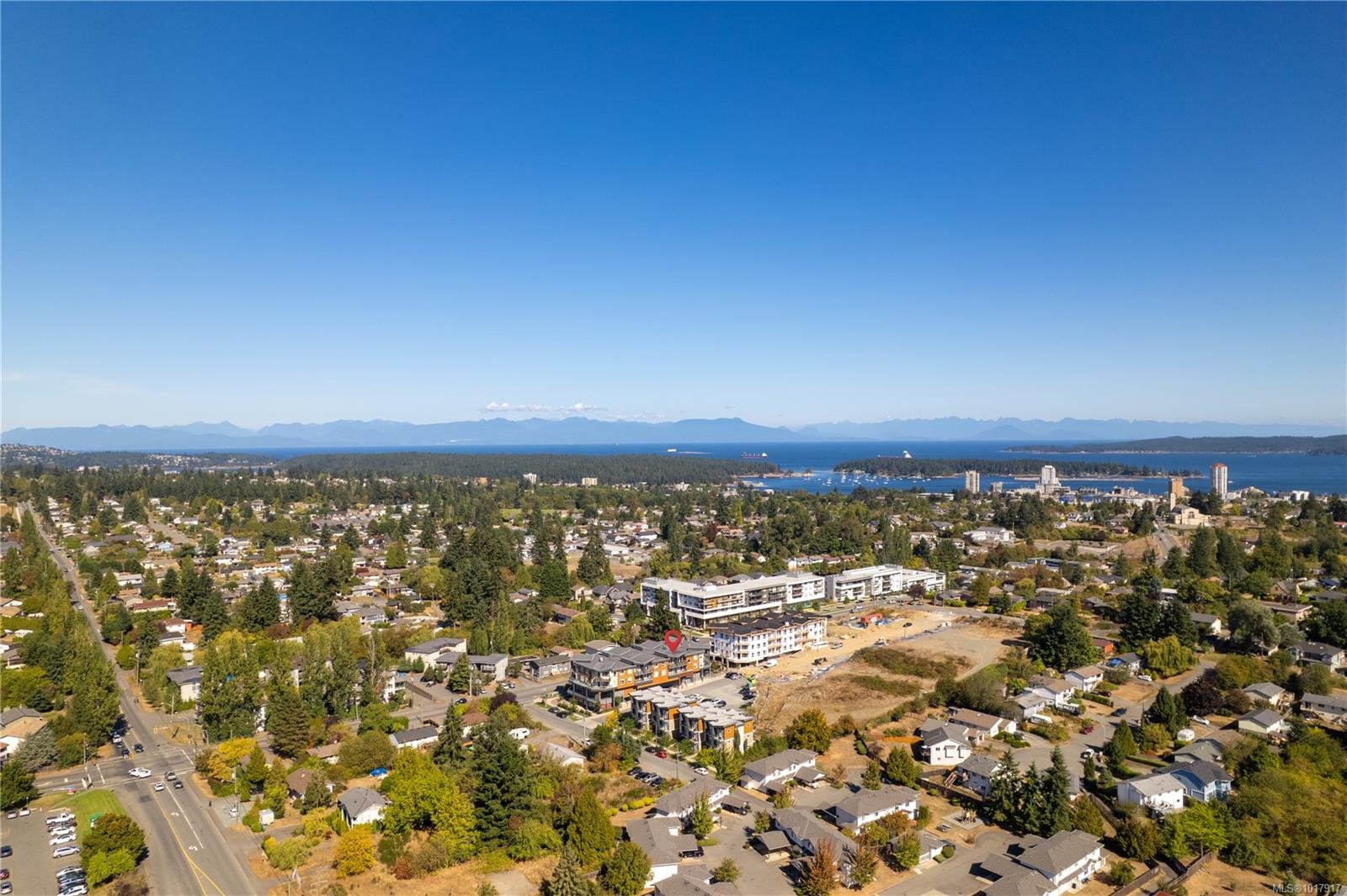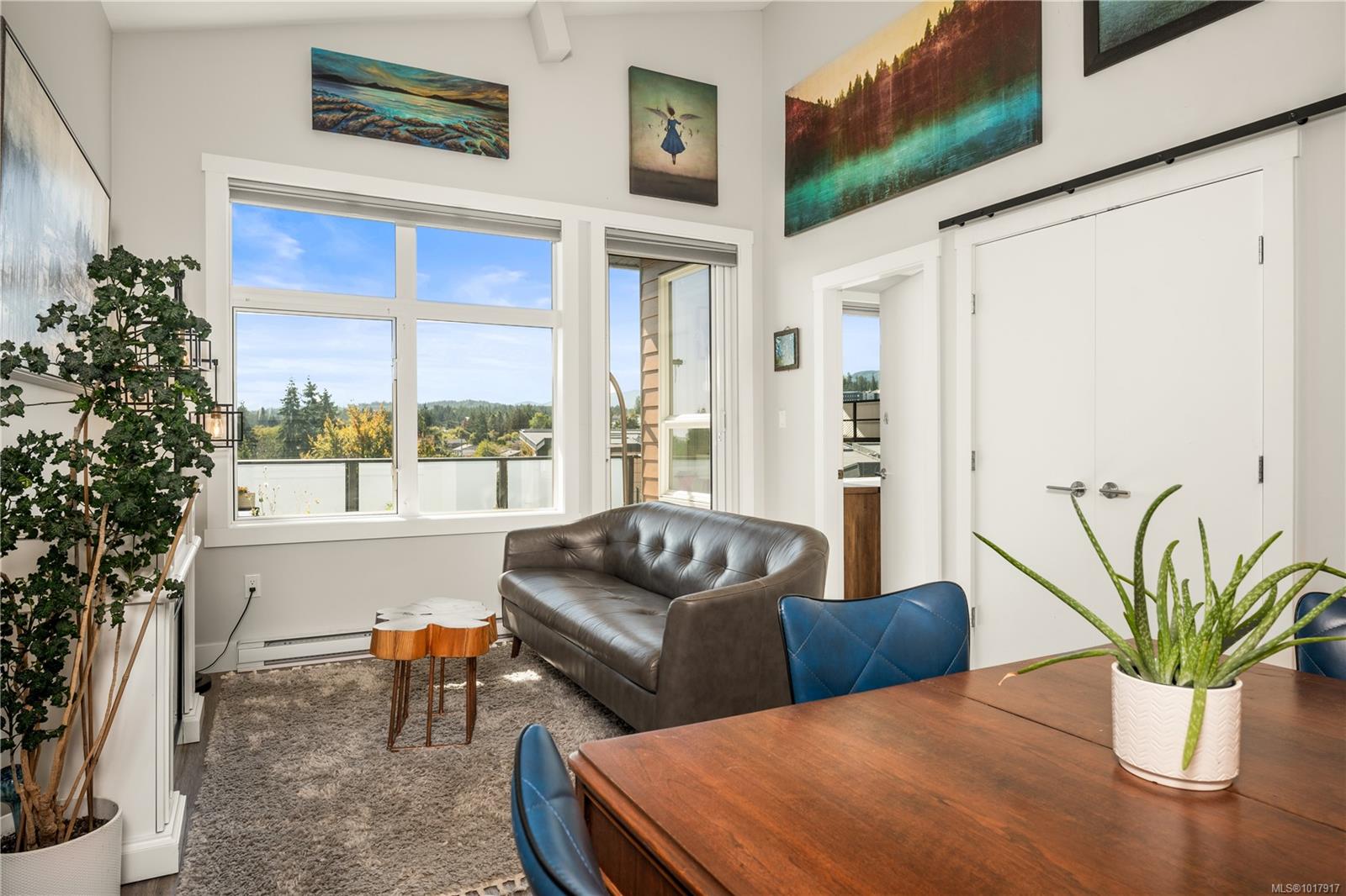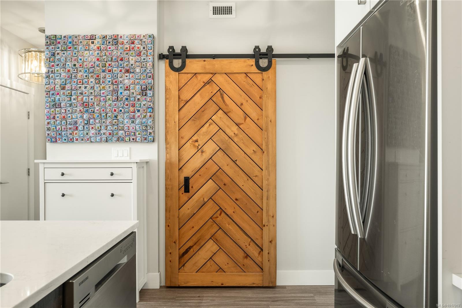 This stylish Top Floor Unit contains 2 bedrooms plus spacious bonus room offers exceptional flexibility for a home office, studio, gym or theatre room. Upgrades throughout include: Custom B.E. glass tiling, granite countertops, black kitchen sink, added cabinetry and storage, custom lighting in every fixture. Unique barn doors with handcrafted hardware, reinforced walls, and custom built closets showcase attention to detail. Large south facing balcony is the longest in the building, perfect for year round gathering. Features include blackout blinds, upgraded bath with custom woodwork & shower doors, built in storage, “Cloffice” & more. Underground parking, visitor parking, bike storage and easy access to VIU, NAC, NDSS, schools, shops & services right in your complex. Truly move in ready one of a kind home. Dogs & Cats welcome, 2 up to 40LBS Each!!! See Special Features List for more!