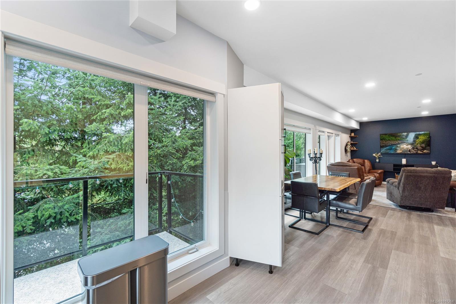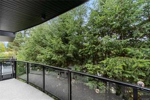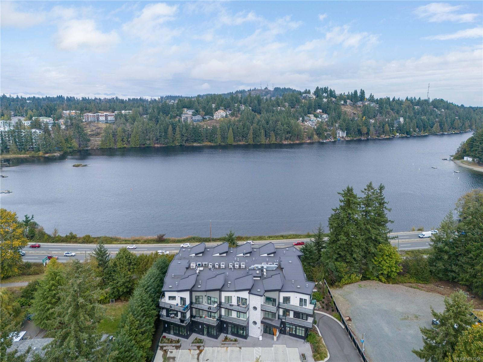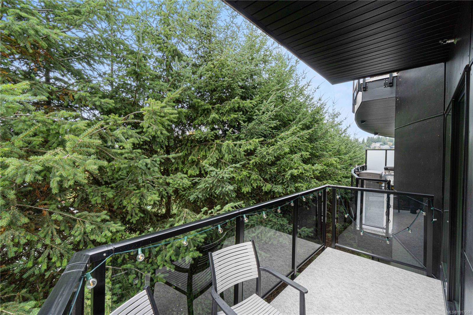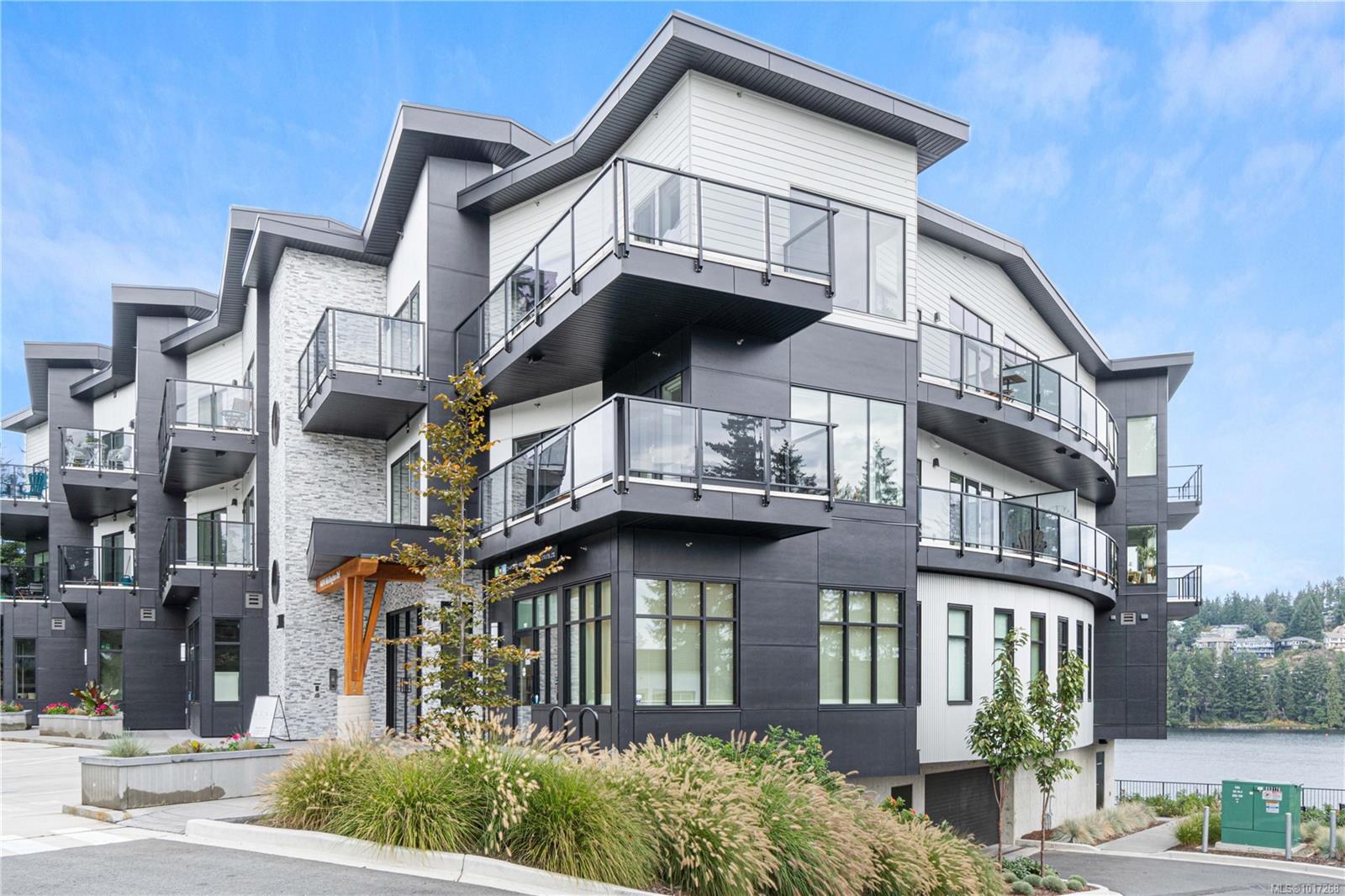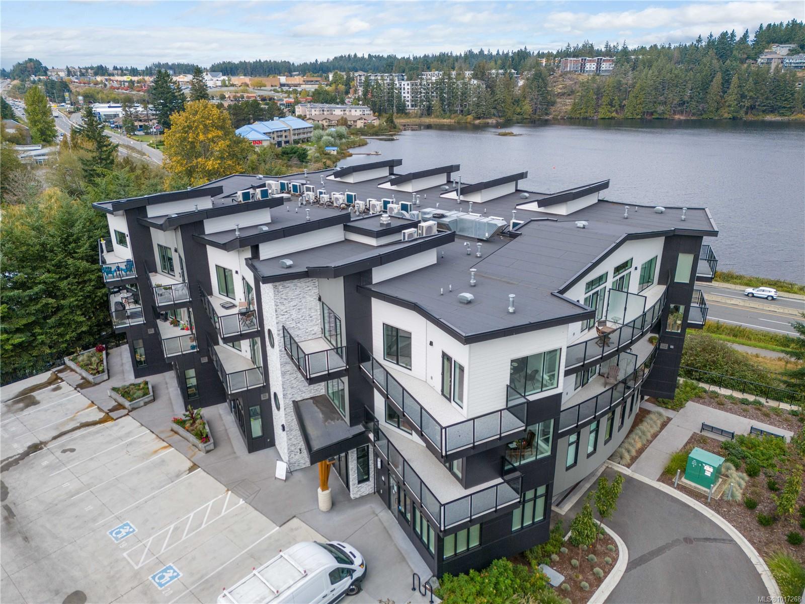 Refined and modern living awaits in this bright and spacious North Nanaimo condo. With only 16 residential units in the building, take pride in having a small footprint and ease of access. This large 1 bed, 1 bath end unit is complete with open concept living, 9 ft ceilings and expansive windows throughout, allowing ample natural lighting. This unit is unique in how much outdoor deck space is offered; with nearly 240 sq ft of overall outdoor space sprawling over 2 balconies wrapping around the unit, backing onto treed privacy. The interior is complete with central forced air and a zone controlled heat pump system. Quality is apparent with upscale finishes throughout including SS appliances, quartz countertops and backsplash, luxury wide plank flooring and high-end cabinetry, with further cabinets added by the owner since purchasing. There is an underground parking stall and storage room. This prime location allows access to Long Lake, Diver Lake, and Brennan Lake within minutes.