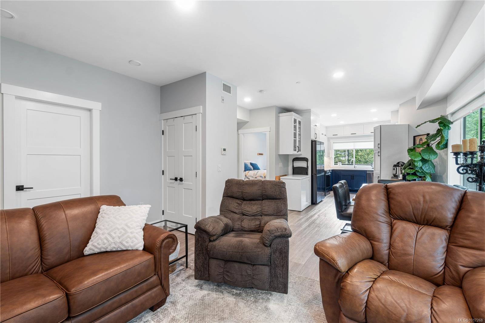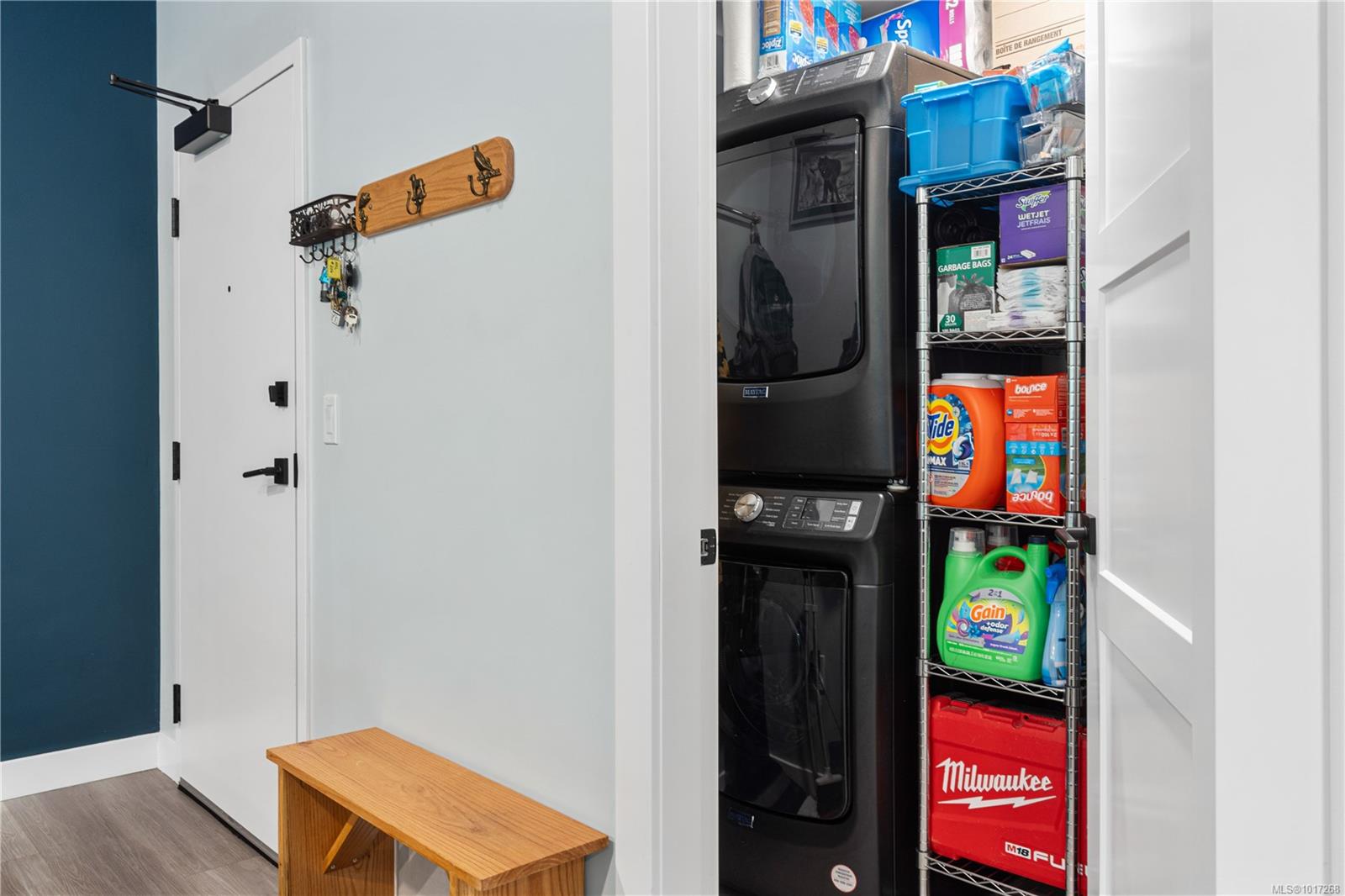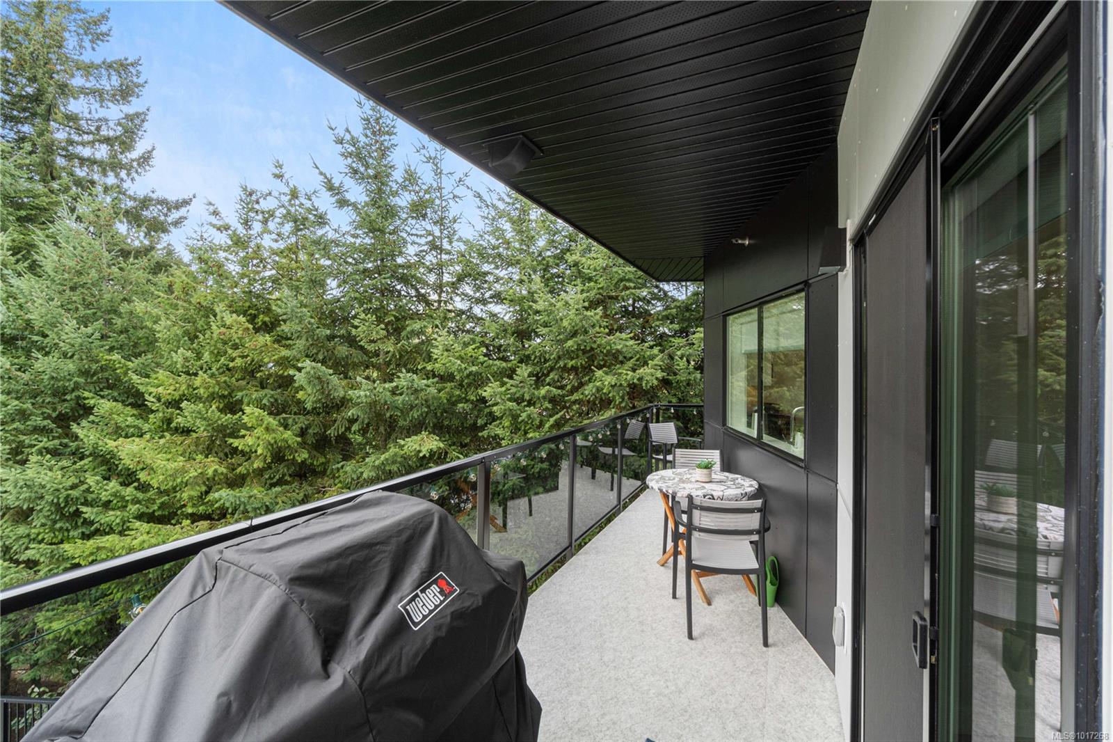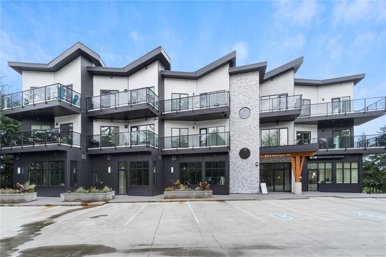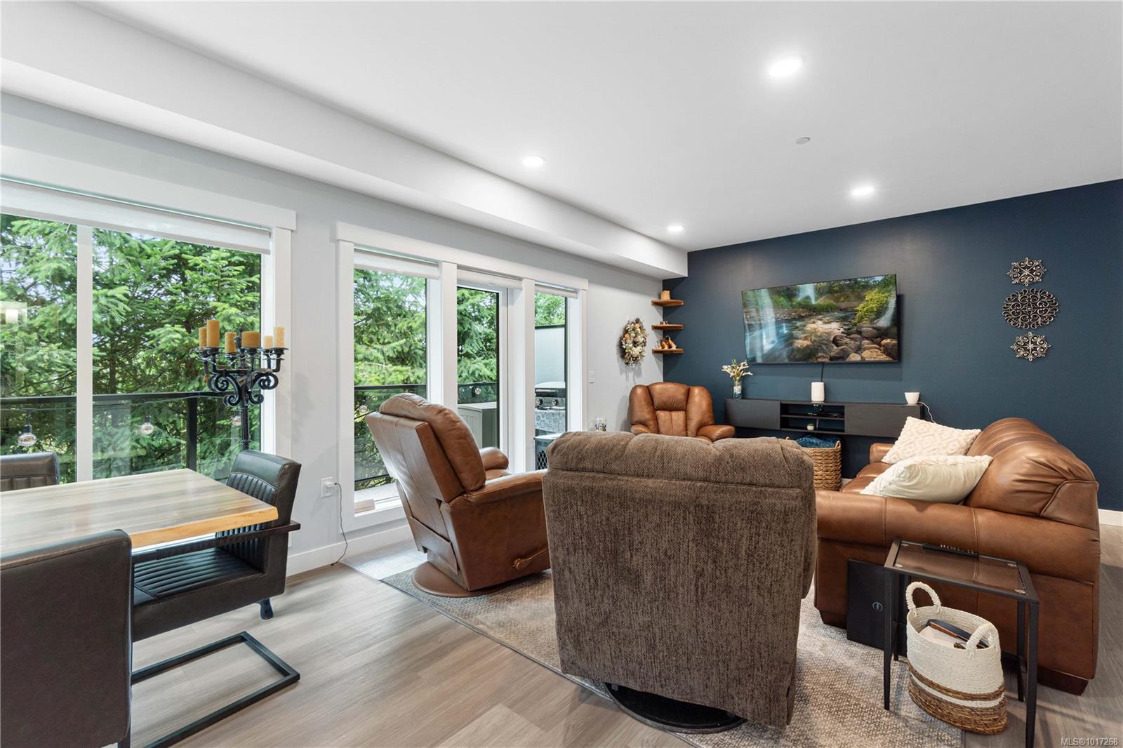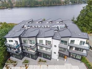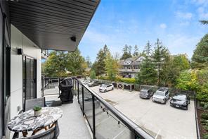 Refined and modern living awaits in this bright and spacious North Nanaimo condo. With only 16 residential units in the building, take pride in having a small footprint and ease of access. This large 1 bed, 1 bath end unit is complete with open concept living, 9 ft ceilings and expansive windows throughout, allowing ample natural lighting. This unit is unique in how much outdoor deck space is offered; with nearly 240 sq ft of overall outdoor space sprawling over 2 balconies wrapping around the unit, backing onto treed privacy. The interior is complete with central forced air and a zone controlled heat pump system. Quality is apparent with upscale finishes throughout including SS appliances, quartz countertops and backsplash, luxury wide plank flooring and high-end cabinetry, with further cabinets added by the owner since purchasing. There is an underground parking stall and storage room. This prime location allows access to Long Lake, Diver Lake, and Brennan Lake within minutes.