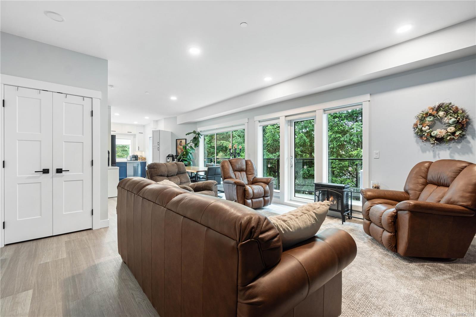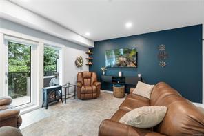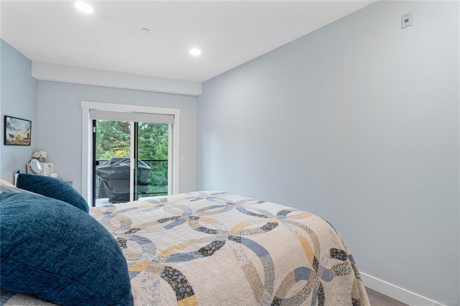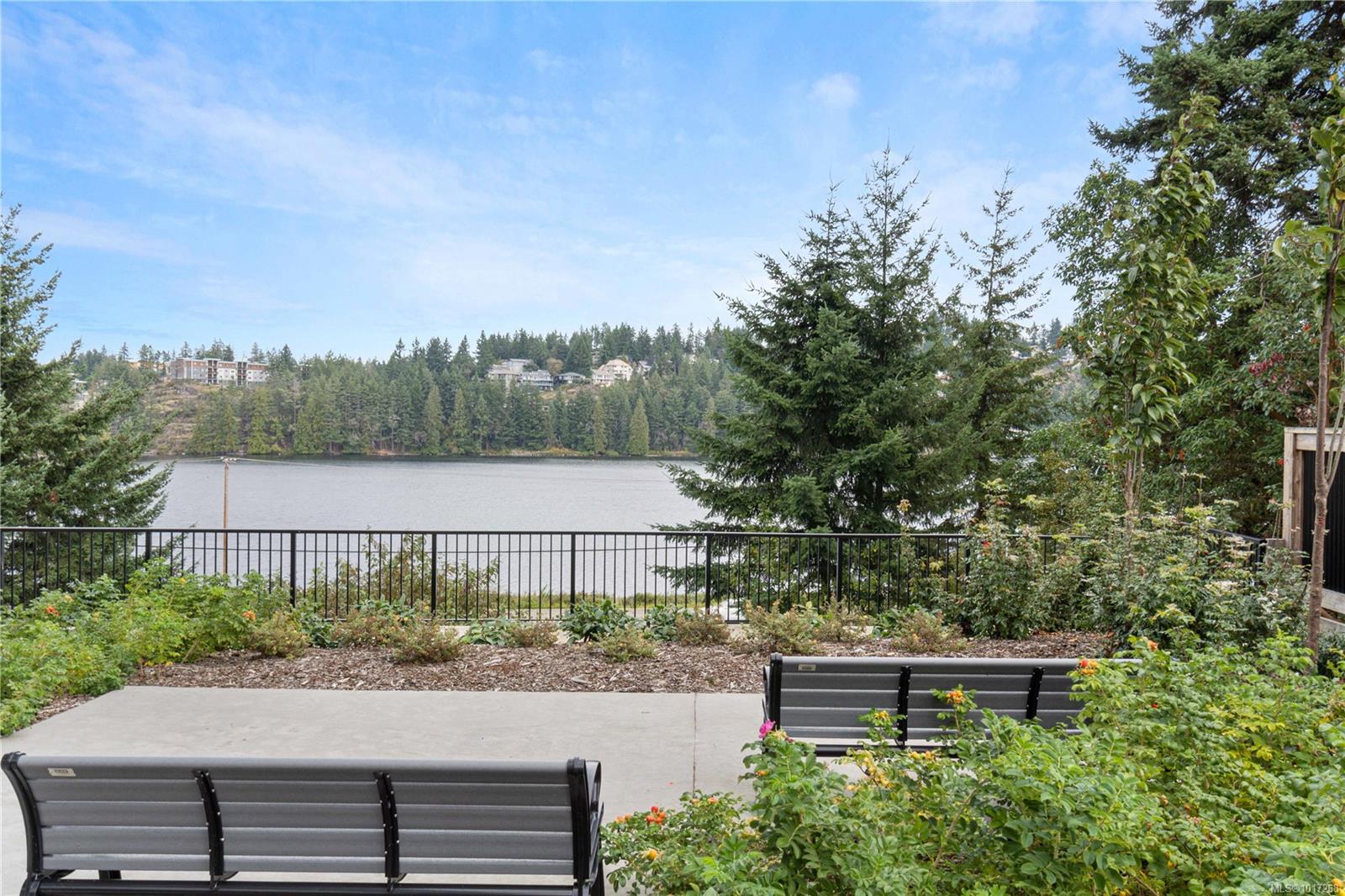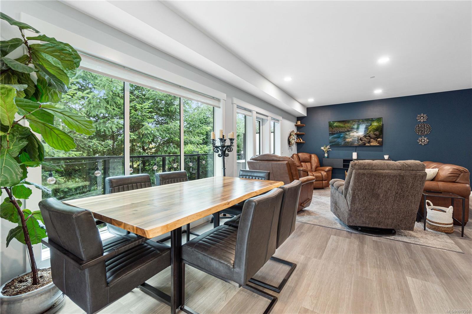Refined and modern living awaits in this bright and spacious North Nanaimo condo. With only 16 residential units in the building, take pride in having a small footprint and ease of access. This large 1 bed, 1 bath end unit is complete with open concept living, 9 ft ceilings and expansive windows throughout, allowing ample natural lighting. This unit is unique in how much outdoor deck space is offered; with nearly 240 sq ft of overall outdoor space sprawling over 2 balconies wrapping around the unit, backing onto treed privacy. The interior is complete with central forced air and a zone controlled heat pump system. Quality is apparent with upscale finishes throughout including SS appliances, quartz countertops and backsplash, luxury wide plank flooring and high-end cabinetry, with further cabinets added by the owner since purchasing. There is an underground parking stall and storage room. This prime location allows access to Long Lake, Diver Lake, and Brennan Lake within minutes.