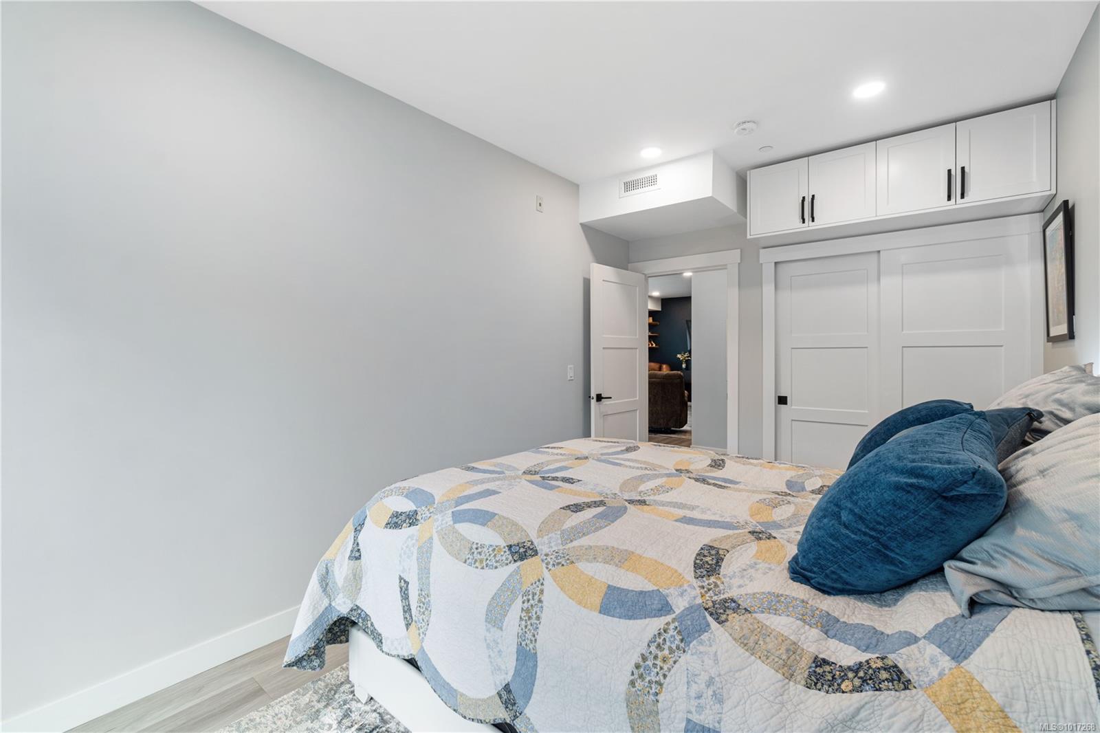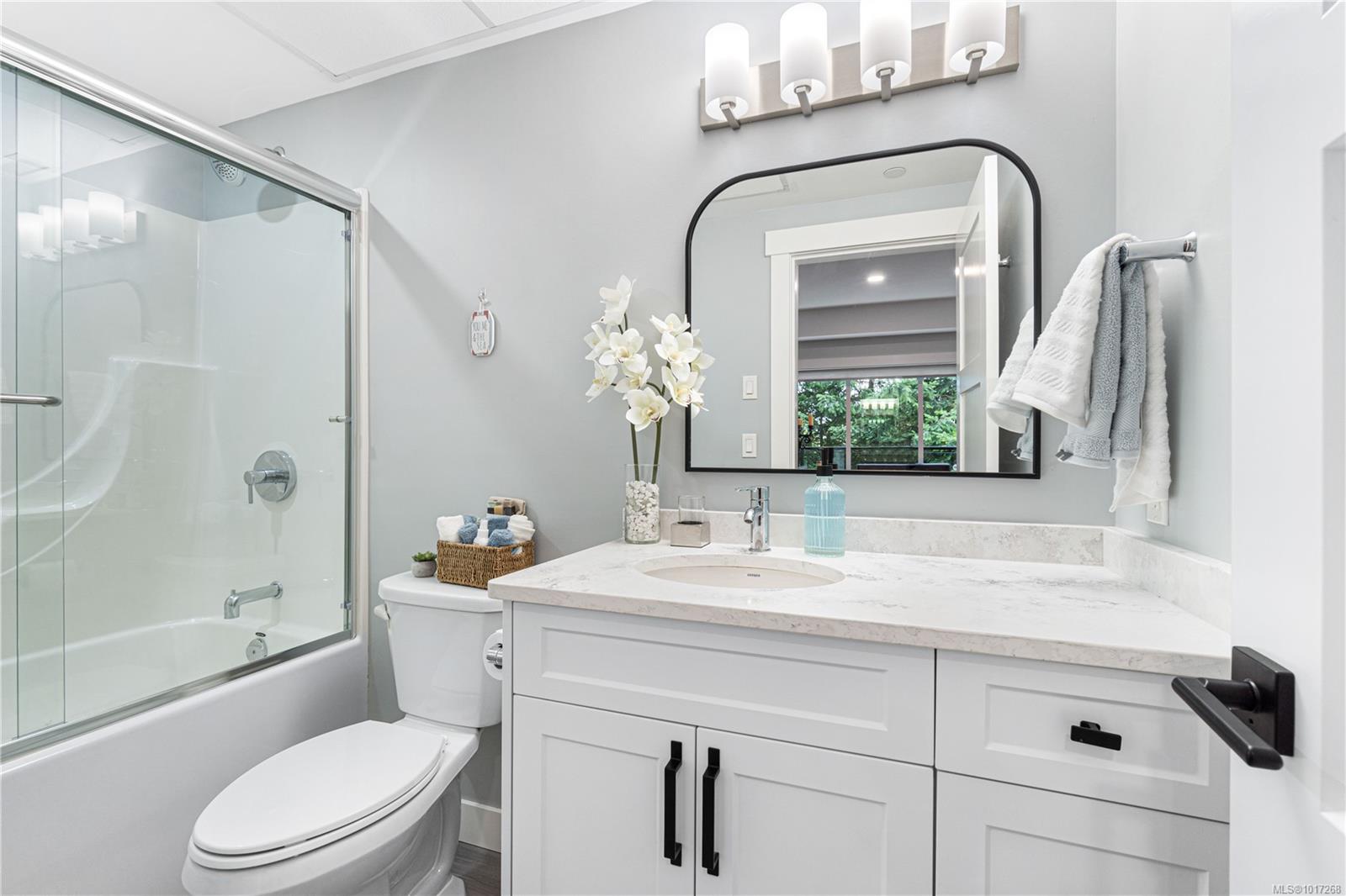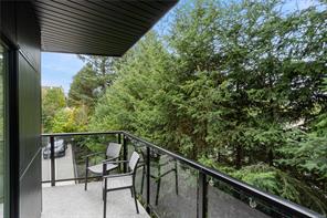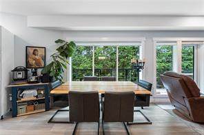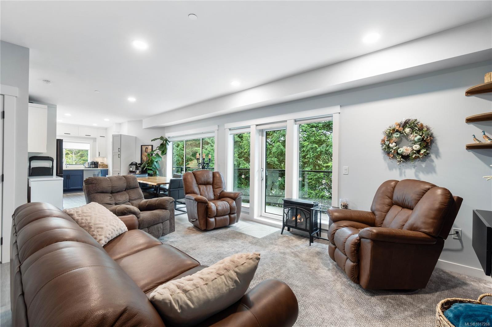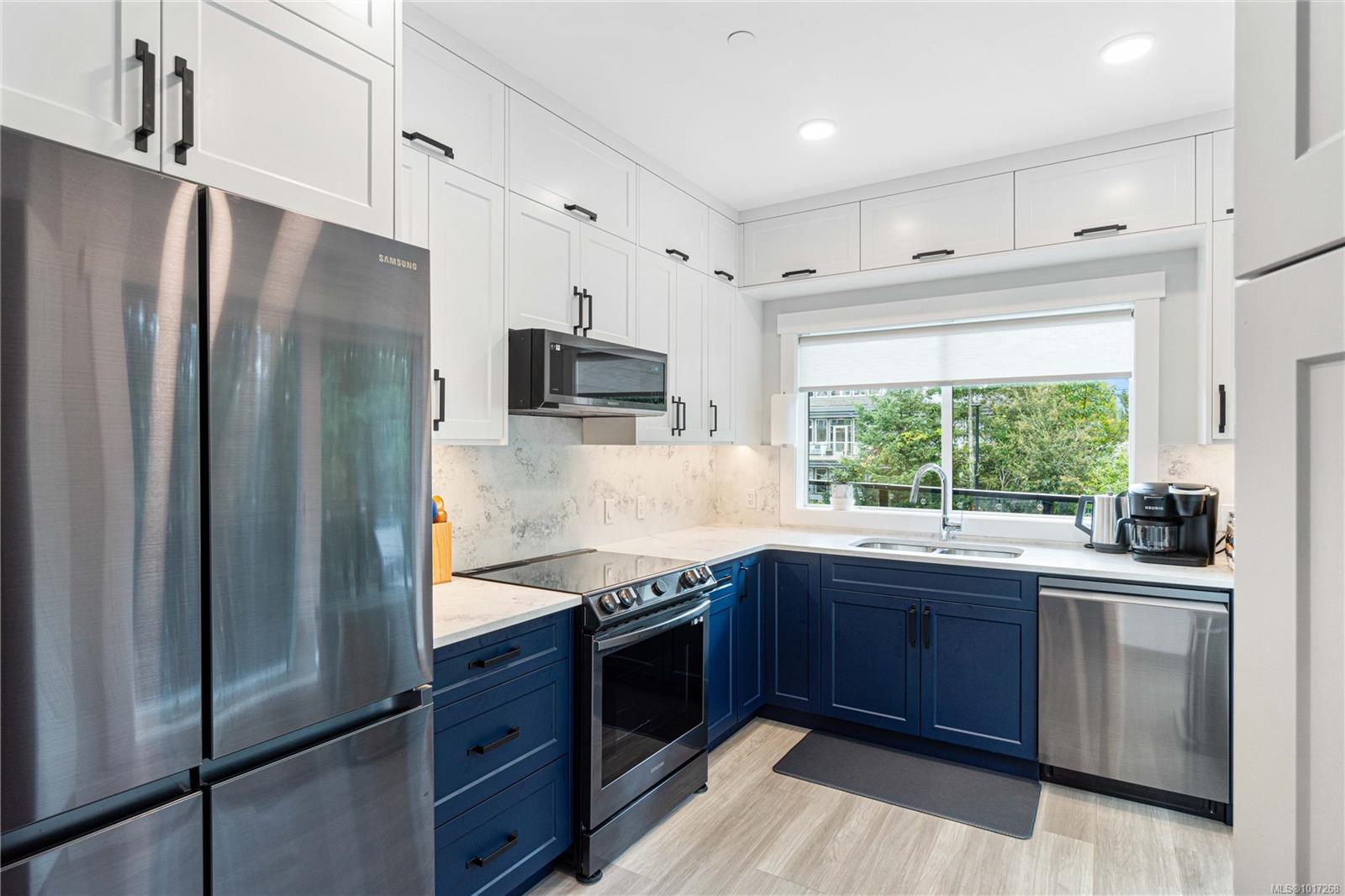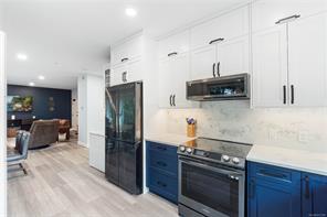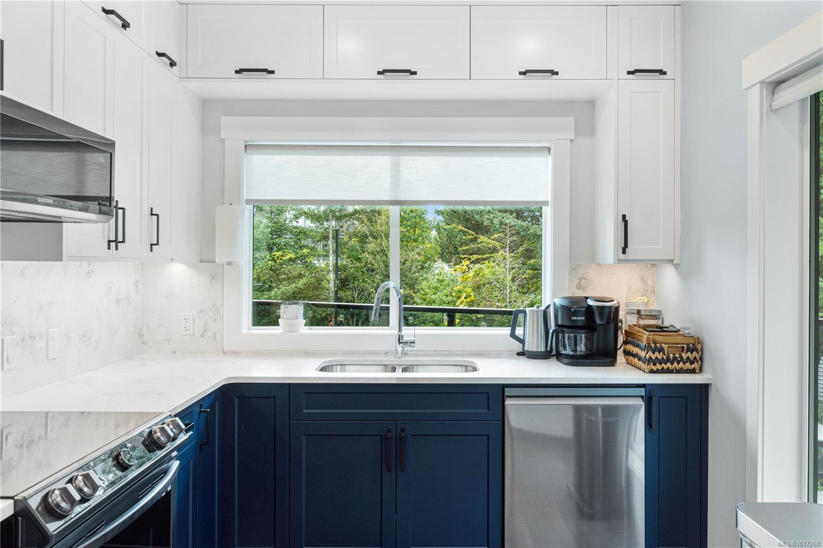 Refined and modern living awaits in this bright and spacious North Nanaimo condo. With only 16 residential units in the building, take pride in having a small footprint and ease of access. This large 1 bed, 1 bath end unit is complete with open concept living, 9 ft ceilings and expansive windows throughout, allowing ample natural lighting. This unit is unique in how much outdoor deck space is offered; with nearly 240 sq ft of overall outdoor space sprawling over 2 balconies wrapping around the unit, backing onto treed privacy. The interior is complete with central forced air and a zone controlled heat pump system. Quality is apparent with upscale finishes throughout including SS appliances, quartz countertops and backsplash, luxury wide plank flooring and high-end cabinetry, with further cabinets added by the owner since purchasing. There is an underground parking stall and storage room. This prime location allows access to Long Lake, Diver Lake, and Brennan Lake within minutes.